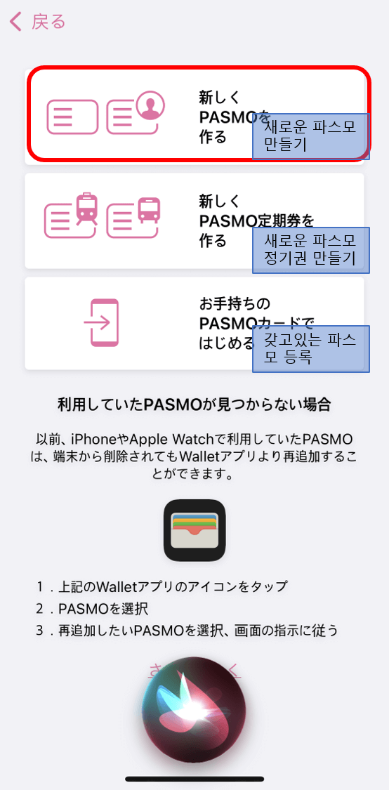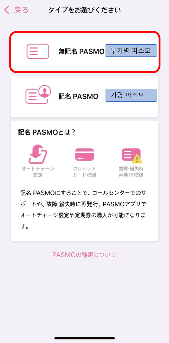 다음 화면에서 가장 위에 있는 '새로운 파스모 만들기'를 선택한 후, 다음 화면에서 역시 가장 위의 '무기명 파스모'를 클릭합니다.