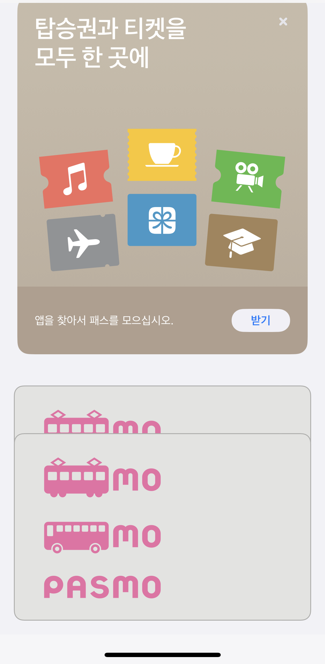 파스모 발행이 완료된 것입니다. 그럼 아이폰의 '지갑'어플에 '파스모'가 나타납니다.