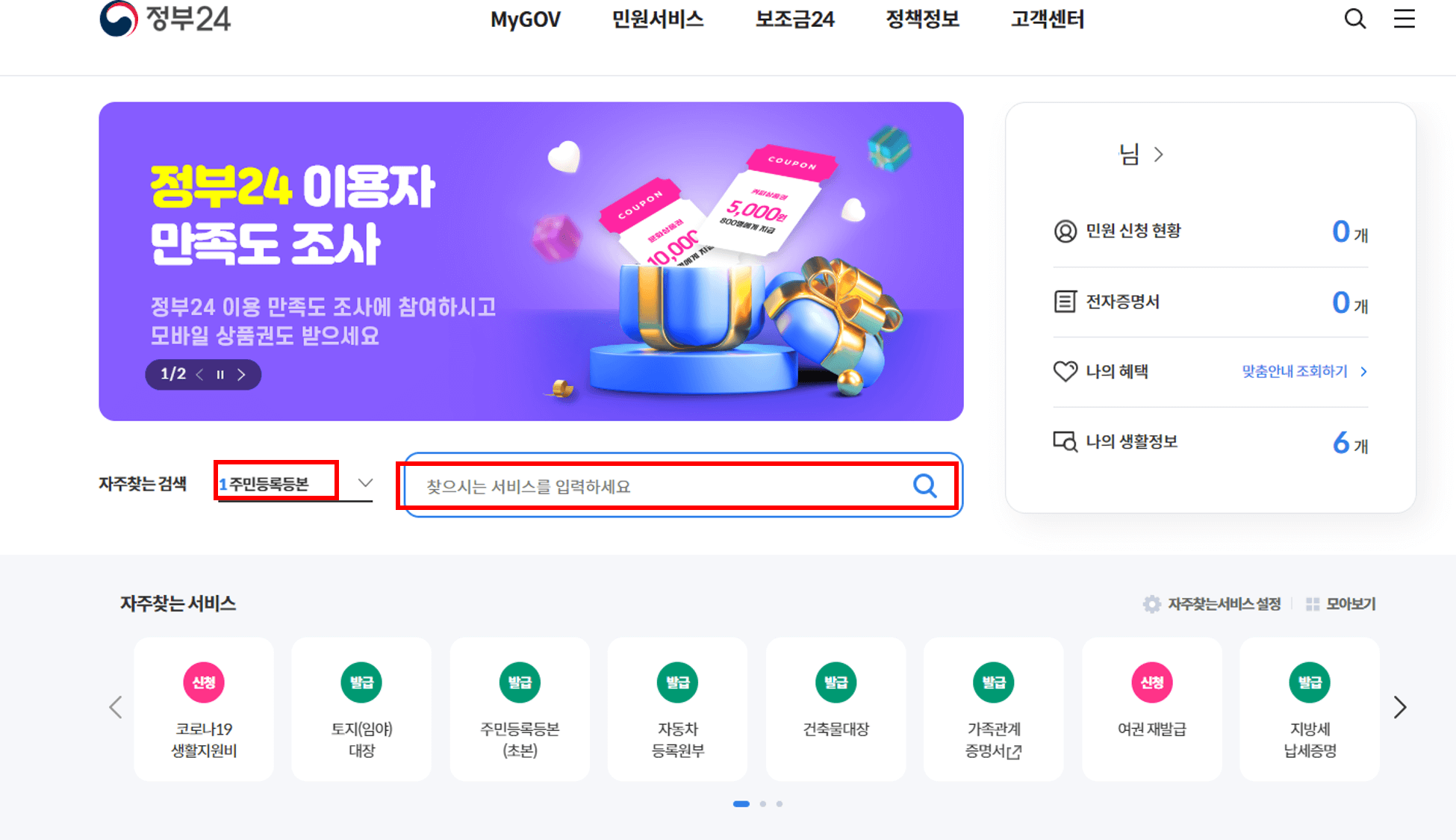 왼쪽 그림이 '정부24' 홈페이지의 메인화면인데요, 여기에서 로그인을 가장 먼저 해주시면 좋습니다. 공인인증서나 공동인증서로 로그인을 하면 오른쪽 상단에 본인의 이름이 뜹니다.