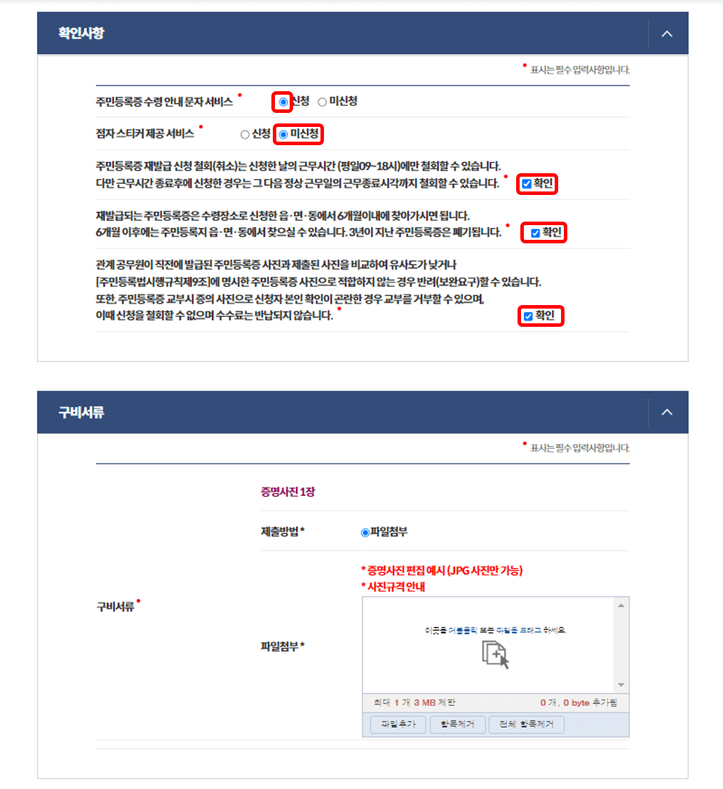 위에서 적은 내용의 개인정보가 표시되고 재발급사유를 선택합니다. 수령문자, 점자 스티커 제공여부 등을 선택하고 안내 내용에 '확인'을 체크 후 사진을 첨부합니다.