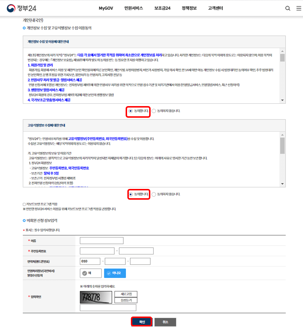 그럼 왼쪽과 같은 로그인을 할 수 있는 팝업이 뜨는데, 여기에서 중요한 점은 반드시 '비회원 신청하기'를 선택해야 한다는 점입니다. 만약 '회원 신청하기'를 선택하게 되면 개명 전의 이름으로 신청하는 꼴이 되므로 새로운 이름으로 신청하는 경우라면 반드시 비회원을 선택해야 합니다. 그 후, 오른쪽과 같은 화면에서 안내사항에 동의를 하고 아래에 이름, 주민번호 등의 개인정보를 입력합니다.