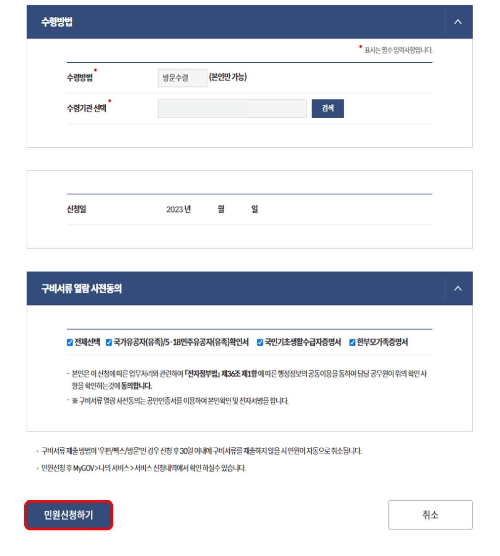 수령방법은 방문수령만 가능하며, 수령기관 선택 후 [민원신청하기]를 선택하면 완료입니다.