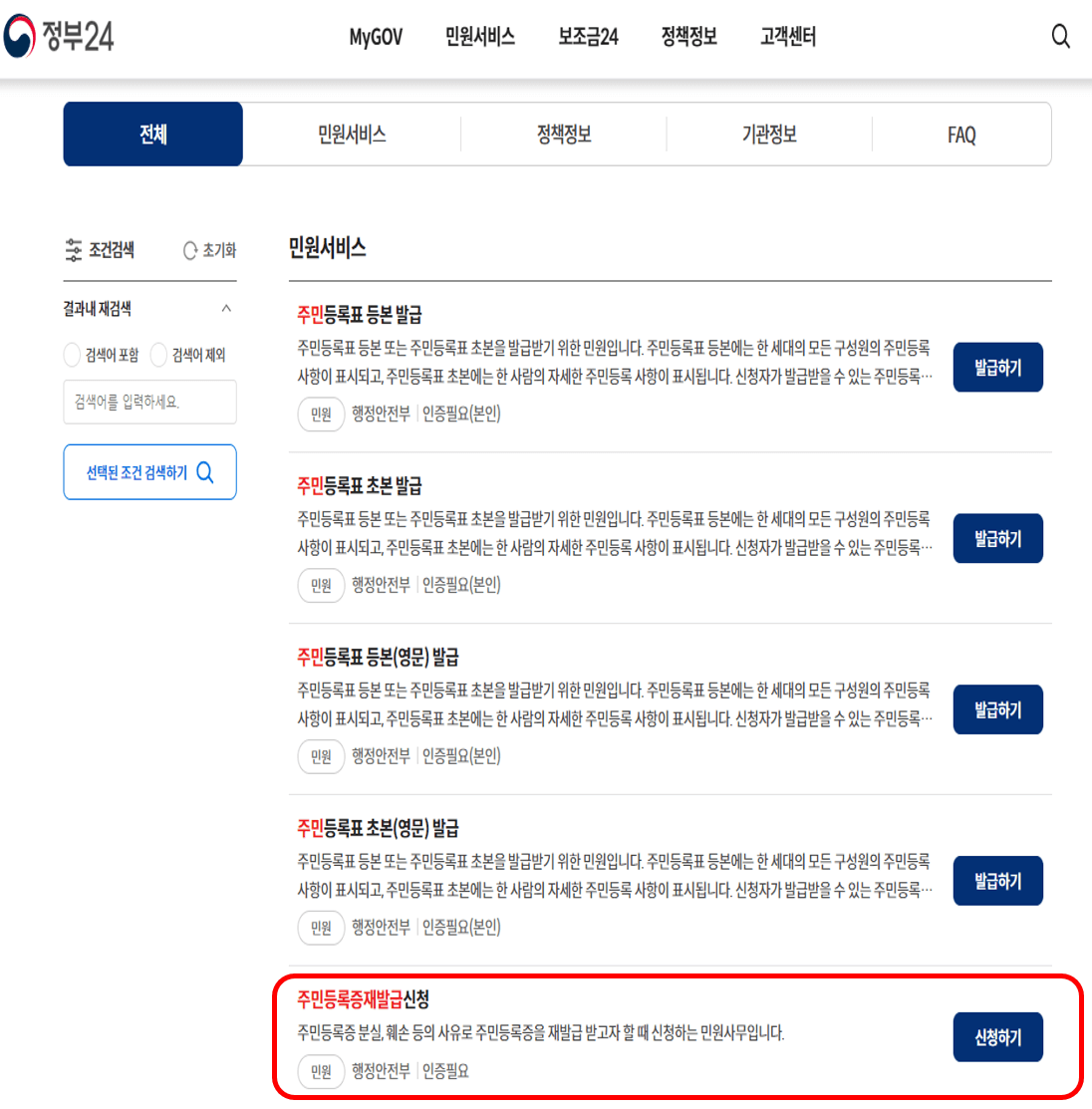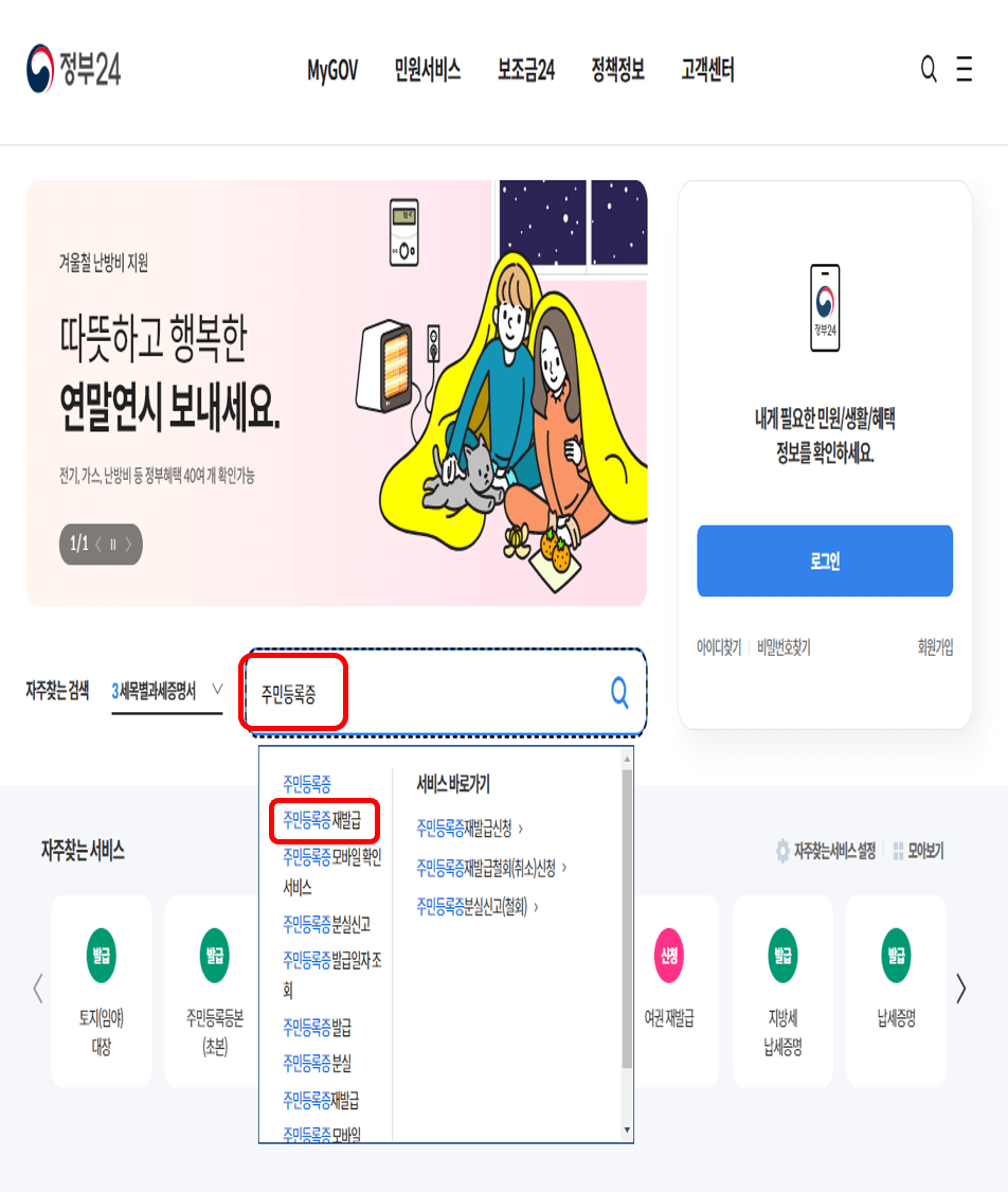 일단 주민등록증을 재발급 받기 위해서는 '정부24' 홈페이지에 접속합니다.
