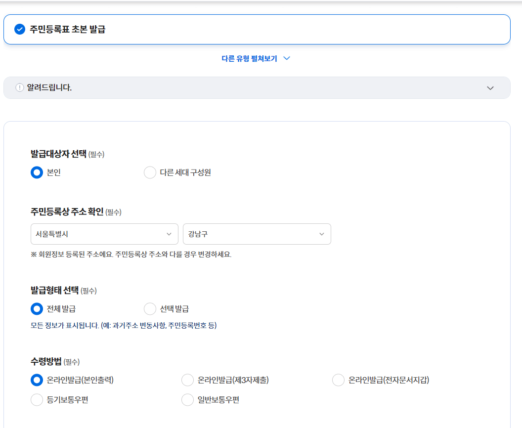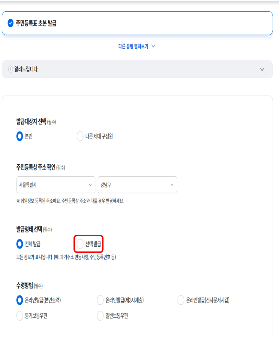 주민등록상 주소를 선택하고, 주의하실 점은 발급형태를 변경해주셔야 한다는 점입니다. 기본이 [전체발급]으로 설정되어있는데, 그대로 뽑으면 과거 주소 변동사항 등 필요하지 않은 정보들까지 출력되므로 꼭 [선택발급]으로 선택해서 개인의 필요에 따라 바꿔줍니다.