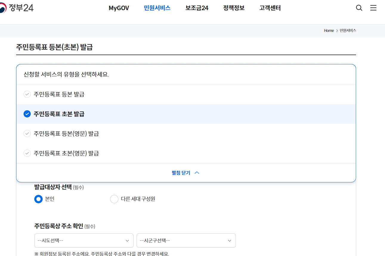 왼쪽과 같은 다음화면에서 기본으로 [주민등록 등본 발급]으로 설정되어있는데, 여기에서 '다른 유형 펼쳐보기'를 눌러 [주민등록표 초본 발급]으로 선택합니다.