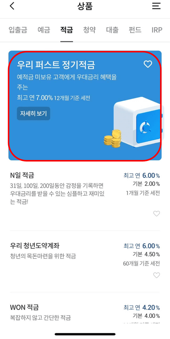 우리WON 어플 메인화면에서 하단 중간 [상품] - 위의 여러 개 메뉴 중 상단 중간 [적금]을 선택합니다. 그럼, 오른쪽과 같이 지금 말씀드리고 있는 [우리 퍼스트 정기적금]이 가장 위에 표시됩니다. [자세히보기]를 누릅니다.