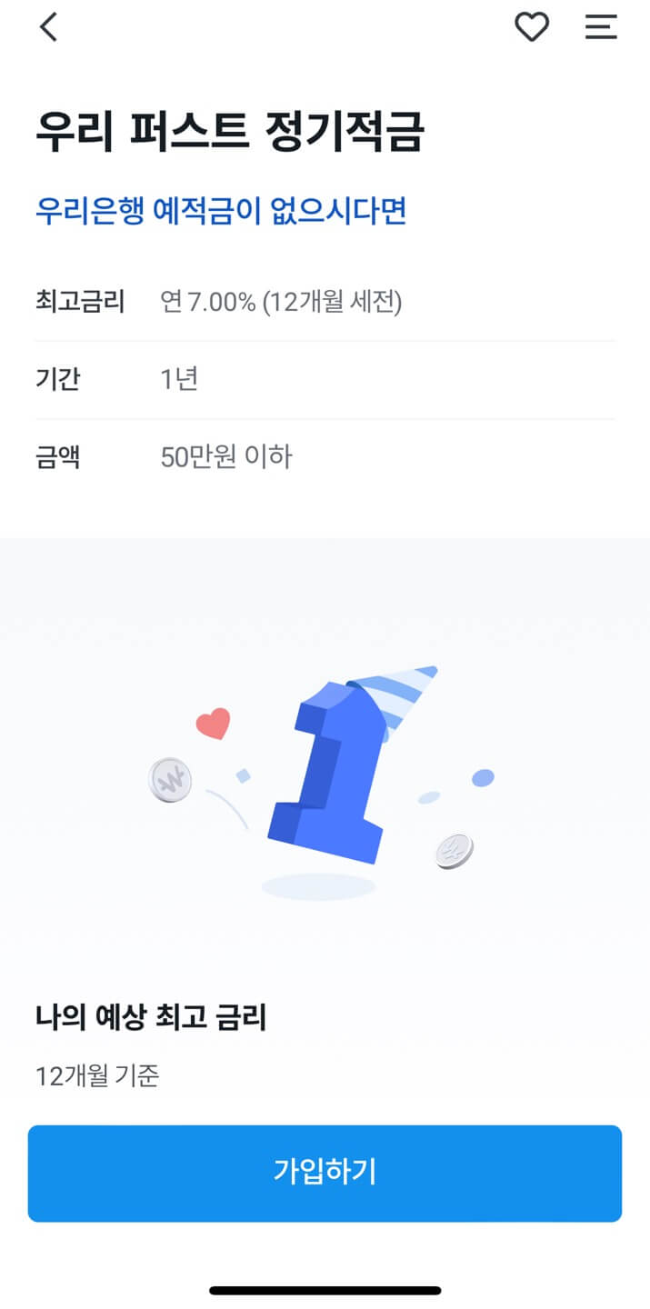 대출금리가 너무 높은 요즘, 대출금리보다 높은 예적금이 있다면 어떨까요? 우리은행에서 올해 초 출시한 우리퍼스트적금은 최고금리가 7%라 관심있게 볼 만해서 알려드리려고 합니다. 물론 제목에서 알 수 있듯이 최고금리가 7%인 거고, 조건이 좋다보니 모두에게 적용되는 것은 아닙니다. 이번 글에서 우리 퍼스트정기적금 가입 조건과 가입방법에 대해 자세히 알려드리겠습니다.