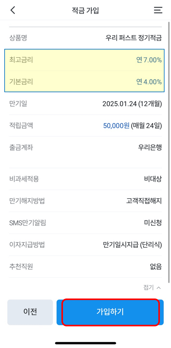 그럼 그림과 같이 금리, 적립금액 등 앞에 기입한 내역이 쭈욱 표시되며 [가입하기]를 누르면 완료됩니다.