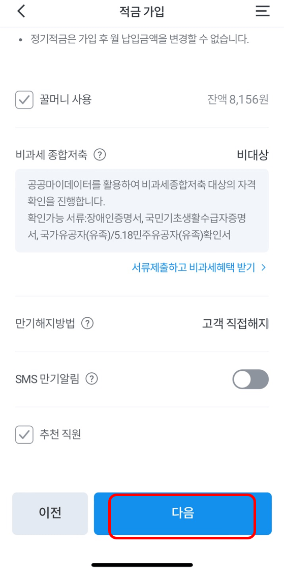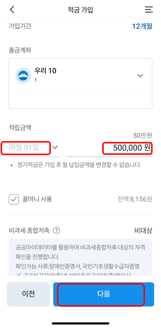 가입기간은 12개월로 고정되어 변경이 안 되고, 출금계좌와 적립금액 등을 선택, [다음]을 누릅니다.