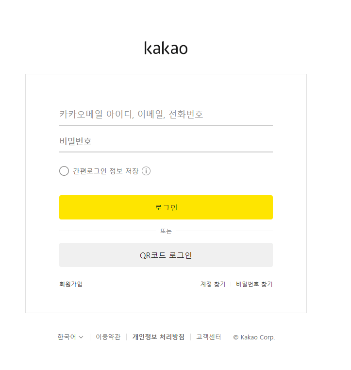 위의 카카오계정 바로가기를 통해 접속하면 오른쪽 그림과 같은 로그인 화면이 뜨는데, 여기에 카카오메일 아이디나 이메일 또는 전화번호와 비밀번호 입력 후 로그인을 누릅니다.