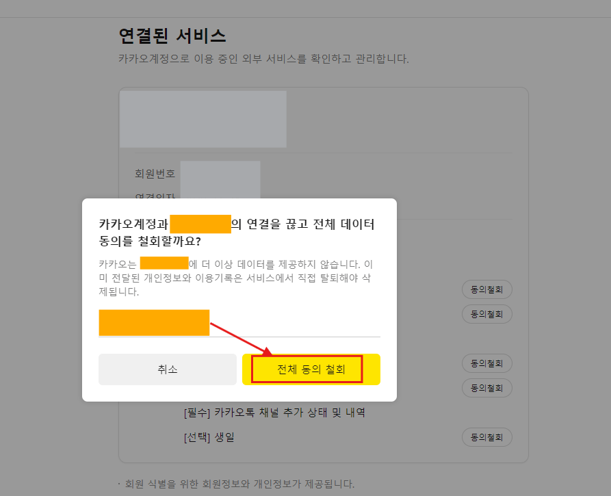 그럼 왼쪽 그림처럼 해지를 원하냐는 팝업이 하나 뜨는데요, 밑줄 부분에 해당 서비스의 이름을 직접 적은 후 노란색 [전체동의 철회]를 클릭합니다. 주의하실 점은 정확하게 해당 서비스의 이름을 적어야 합니다. 만약 서비스의 이름이 정확하게 입력되지 않으면 해지 처리가 제대로 되지 않습니다. 다시 말해 위의 주황색 네모 부분 세 개가 모두 일치해야 서비스 탈퇴가 가능합니다.