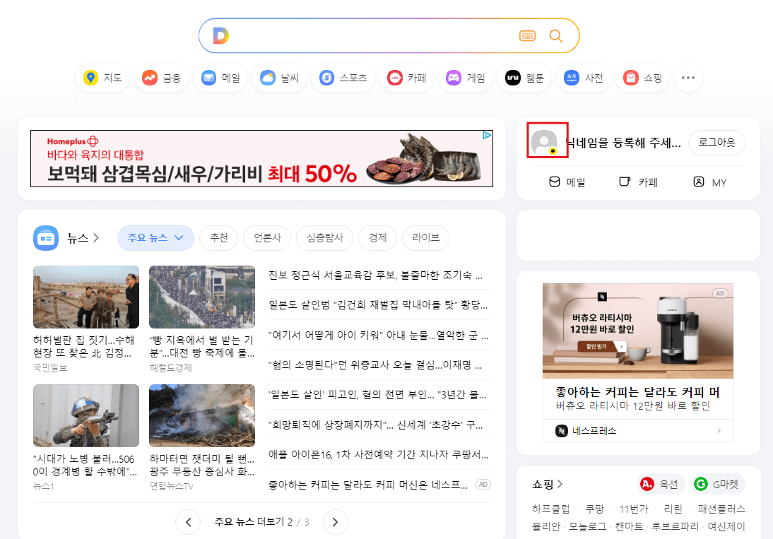 두 번째 방법은 다음 홈페이지를 통한 카카오계정 로그인입니다. 다음 홈페이지에서 로그인 후, 오른쪽 그림과 같은 메인 화면에서 동그란 프로필 그림을 클릭하면 본인의 카카오계정에 연결됩니다.