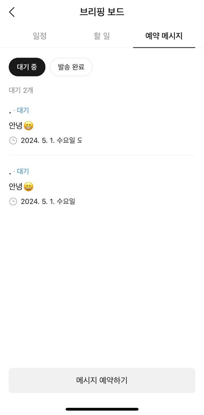 우선, 예약메시지를 작성할 때와 같은 경로로 들어가면 아래 [예약 목록 보기]를 누릅니다. 그럼 오른쪽 그림처럼 본인이 작성한 예약메시지가 표시됩니다.