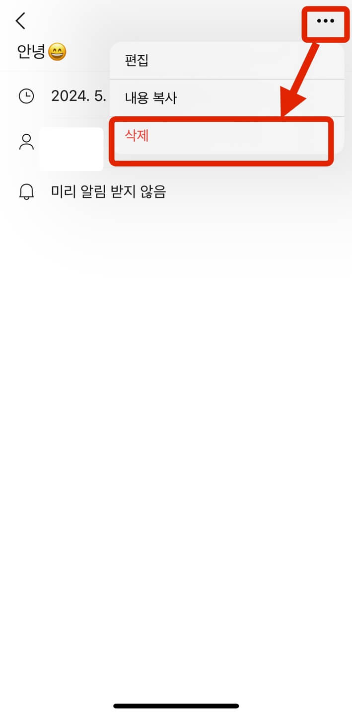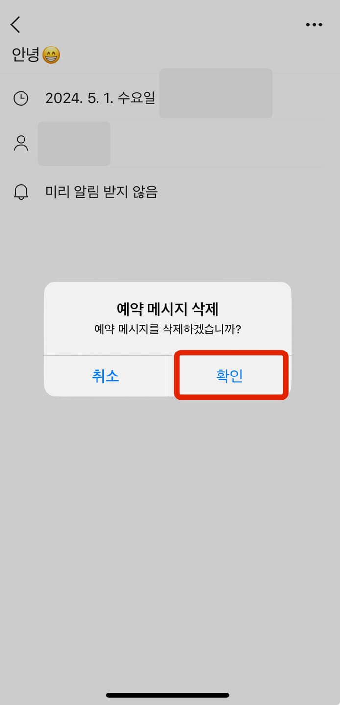 그 중에서 삭제하고자 하는 메시지를 선택하면 왼쪽과 같은 화면이 나타나는데, 우측 상단 [점 세개] - [삭제]를 선택합니다. 그럼 오른쪽과 같은 예약메시지를 삭제하겠냐는 팝업이 뜨고 [확인]을 누르면 삭제가 완료됩니다.