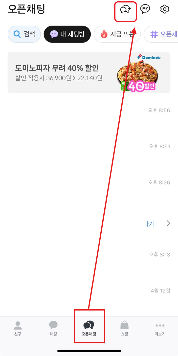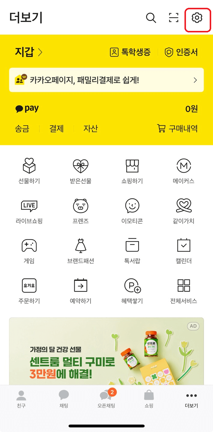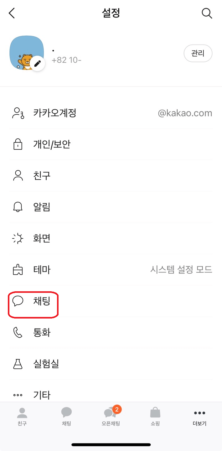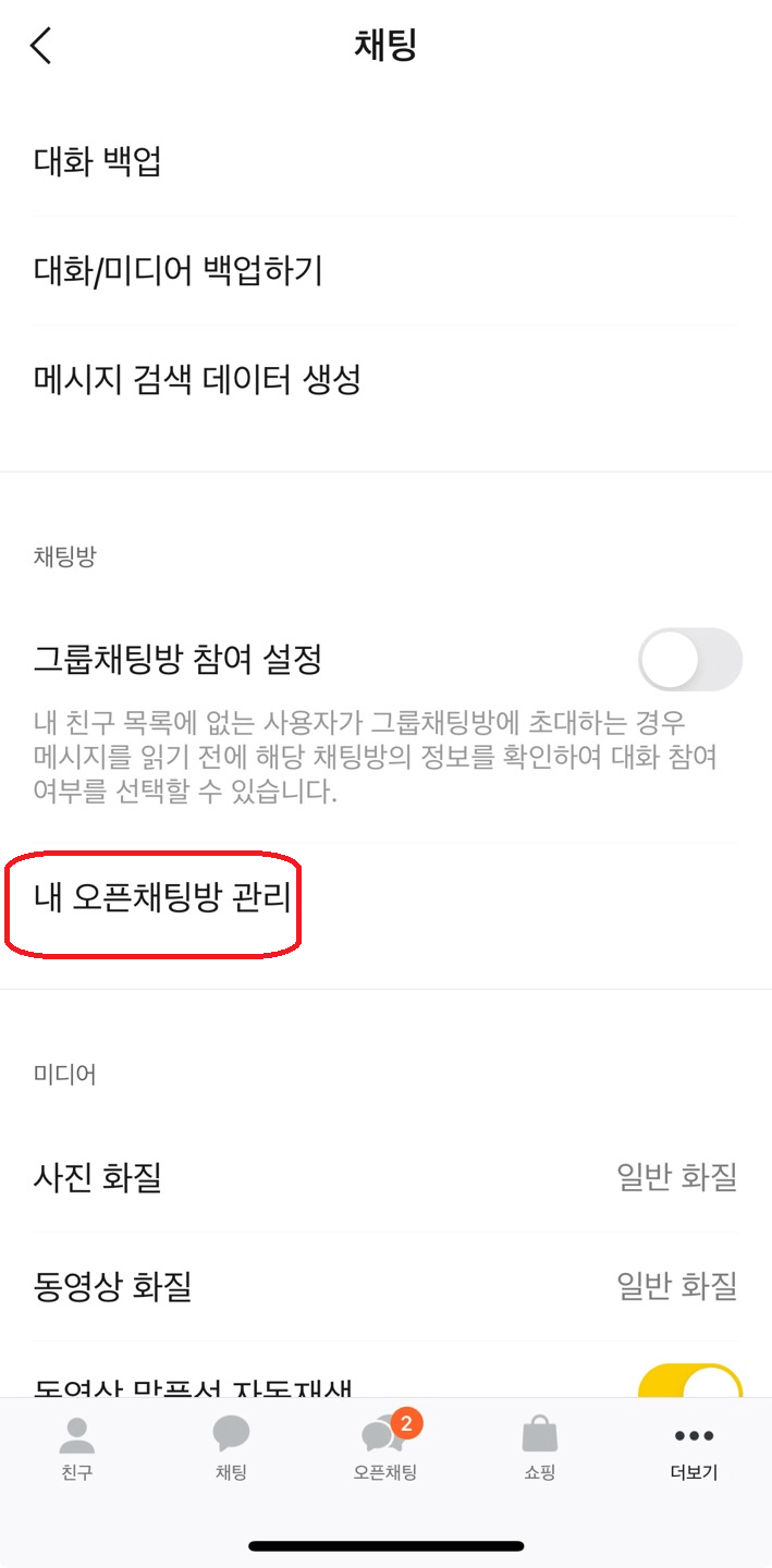 우측 하단 [더보기] - 상단 우측 [톱니바퀴] - [채팅] - [내 오픈채팅방 관리]를 차례대로 선택합니다.