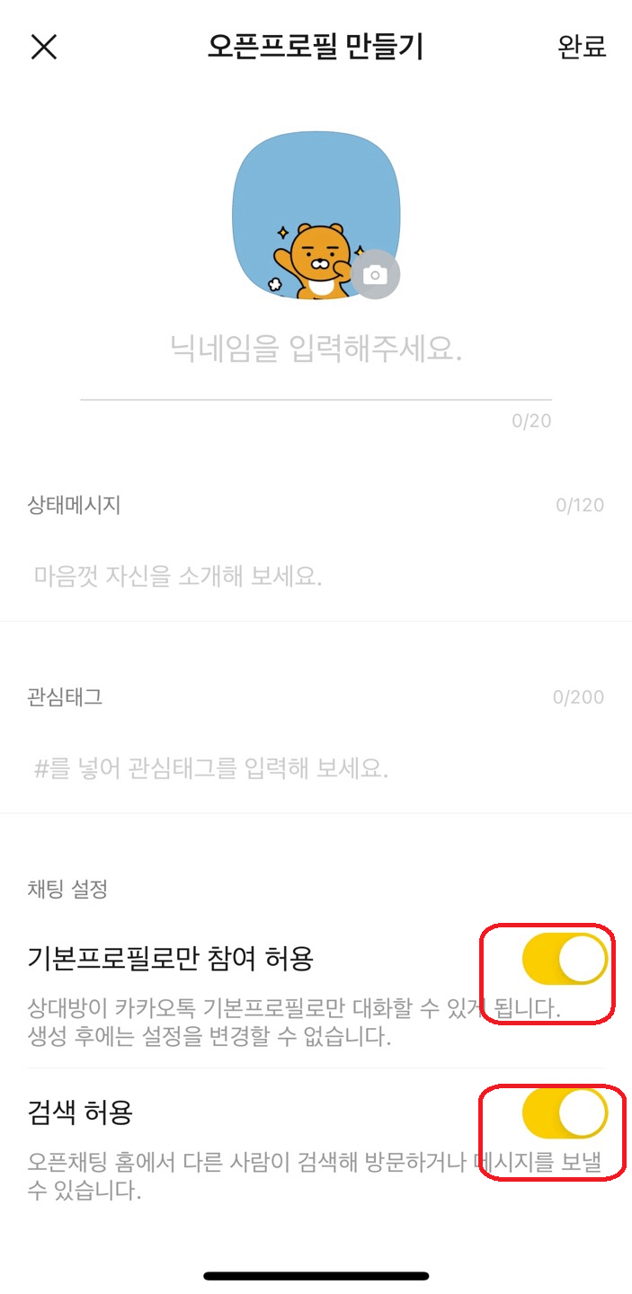 위에 보이는 창에서 닉네임, 사진 등을 설정할 수 있으며, 아래 [기본프로필로만 참여 허용], [검색 허용] 등을 조정하여 설정, 변경할 수 있습니다.