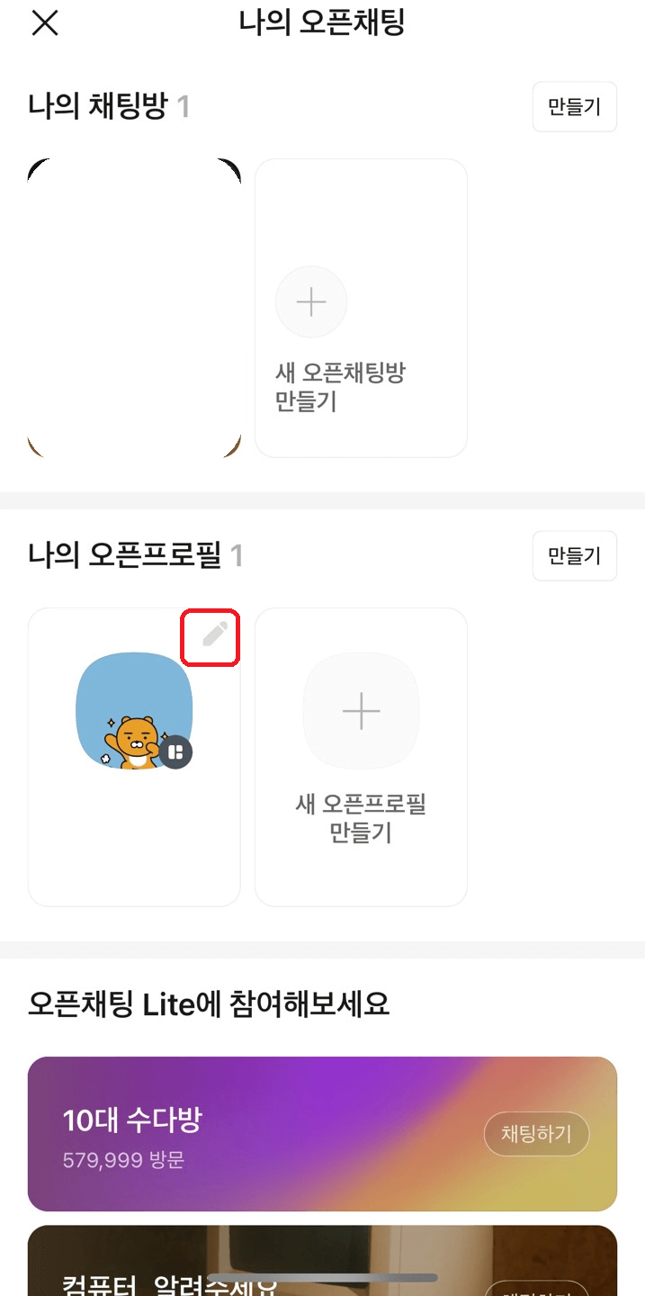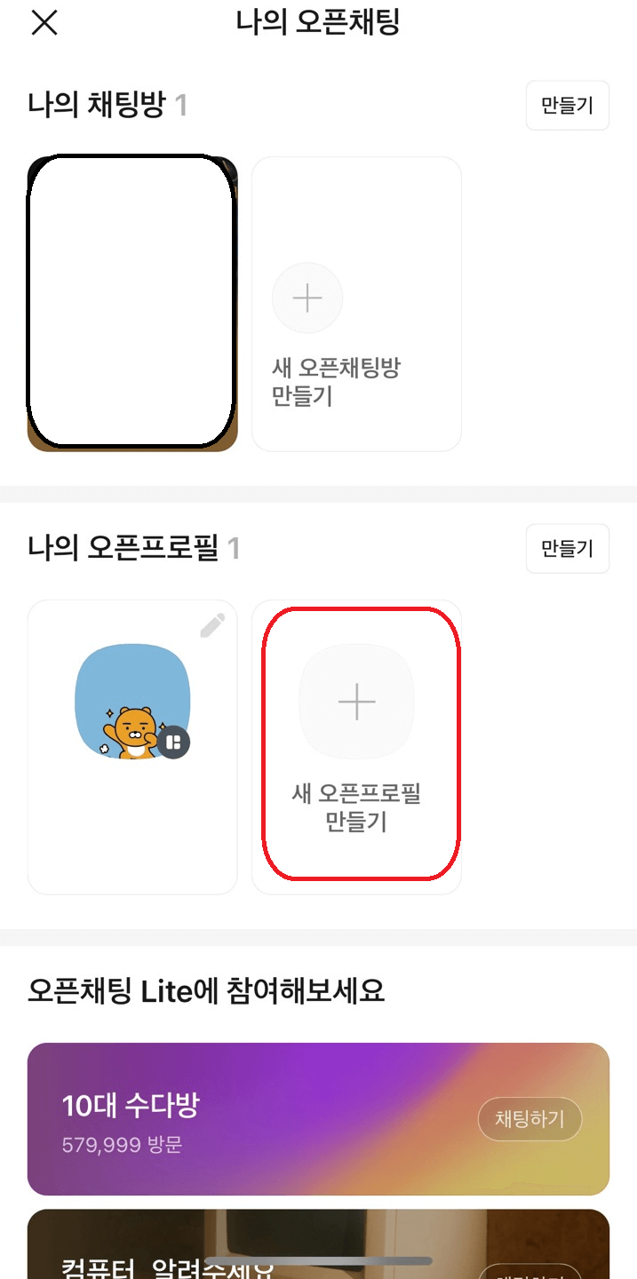 그럼 위와 같은 창에서 현재 내가 참여하고 있는 오픈채팅방과 내 오픈프로필 등을 보실 수 있는데요, 이 때 '내 오픈프로필' 오른쪽 [새 오픈프로필 만들기]를 눌러서 1번과 동일한 방식으로 설정 가능합니다.