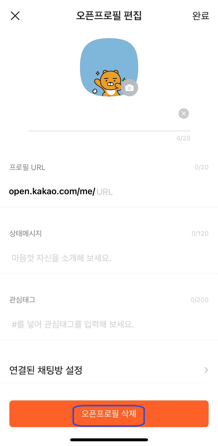 오픈프로필을 설정하면 삭제하는 방법도 당연히 있겠죠. 눈치 빠르신 분들은 이미 위의 설명만으로도 방법을 아셨을거라 생각하는데요, 오픈프로필 설정 화면 삭제 가능합니다.