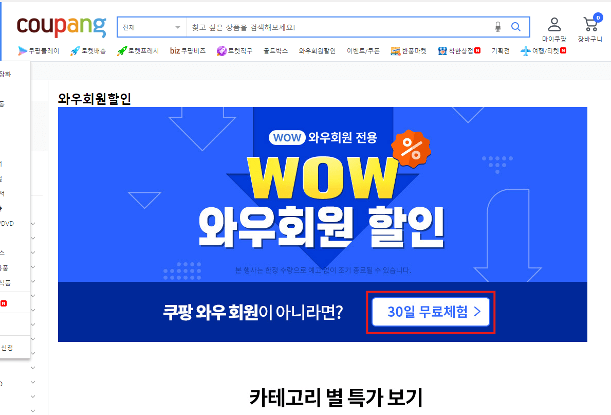 왼쪽과 같은 메인화면에서 상단 우측의 [와우회원할인]을 누릅니다. 그럼 오른쪽 그림처럼 [30일 무료체험] 이벤트 페이지가 나타나는데요, 이 버튼을 클릭해서 30일을 무료체험하고 그 이후에 월회비가 자동으로 결제됩니다.