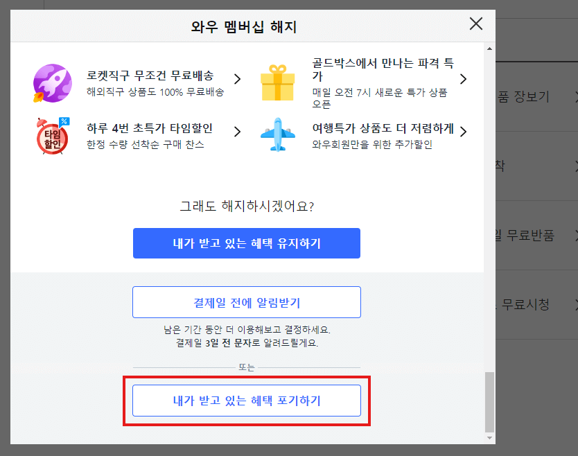 다음 화면에서 다시 한번 와우 멤버 해지를 정말 할 거냐고 확답을 듣는 절차가 있습니다. 마음이 확고하다면 [내가 받고 있는 혜택 포기하기]를 누르면 완료됩니다. 이때 주의할 점은 멜론처럼 음악 스트리밍 서비스와 달리 해지를 하면 그때부터 이용이 중지됩니다. 따라서 월회비 혜택 유지기간이 남아있다면 그 혜택일까지 마저 채우고 해지하시길 당부드립니다.
