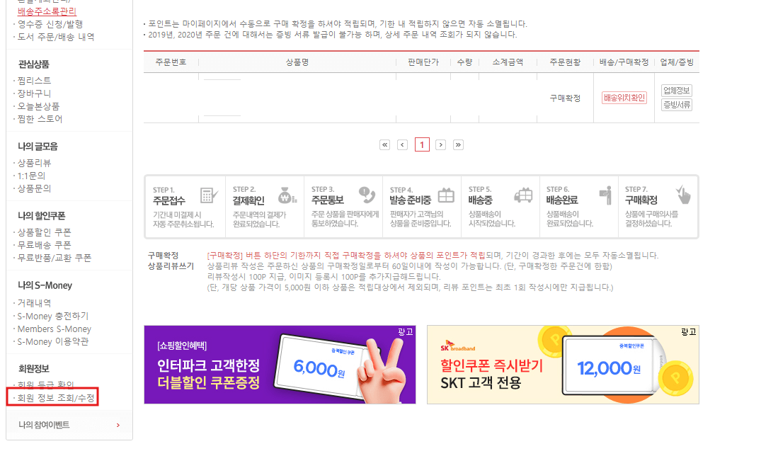 먼저 우측상단 [마이페이지] - [마이페이지]를 선택합니다. 그럼 오른쪽 그림과 같은 화면이 나오는데, 좌측 하단 [회원 정보 조회/수정]을 누릅니다.
