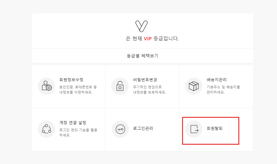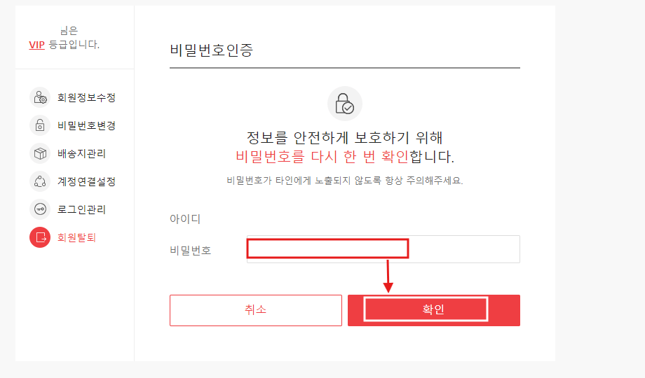 왼쪽과 같은 다음 화면에서 [회원탈퇴]를 선택합니다. 다음화면에서 비밀번호를 한 번 더 입력 후 [확인]을 클릭합니다.