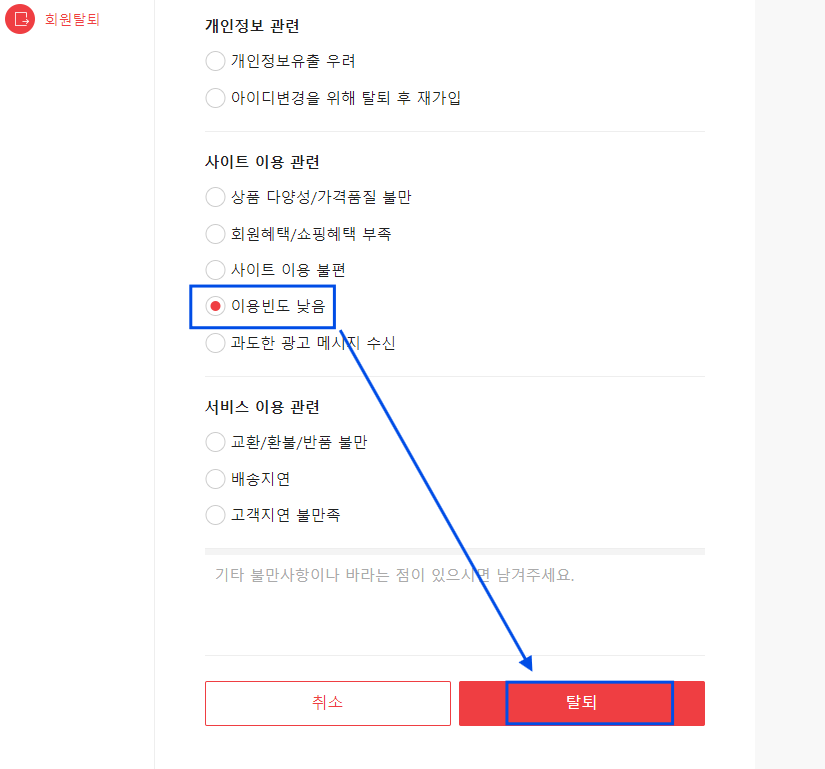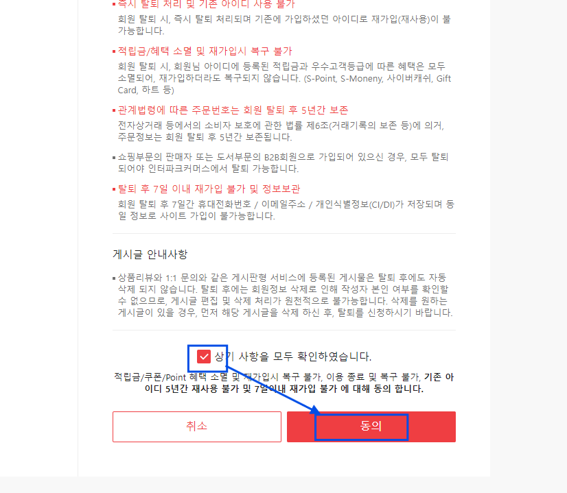 다음 화면에서 회원탈퇴에 관한 안내사항이 나오는데, 내용을 확인했다는 체크박스에 [체크] 후, [동의]를 누릅니다. 다음 화면에서 회원탈퇴 사유를 선택 후, 아래 [탈퇴] 버튼을 누르면 완료됩니다.