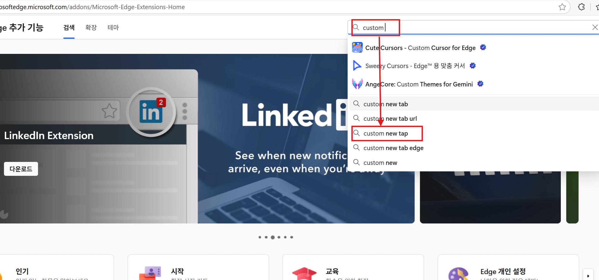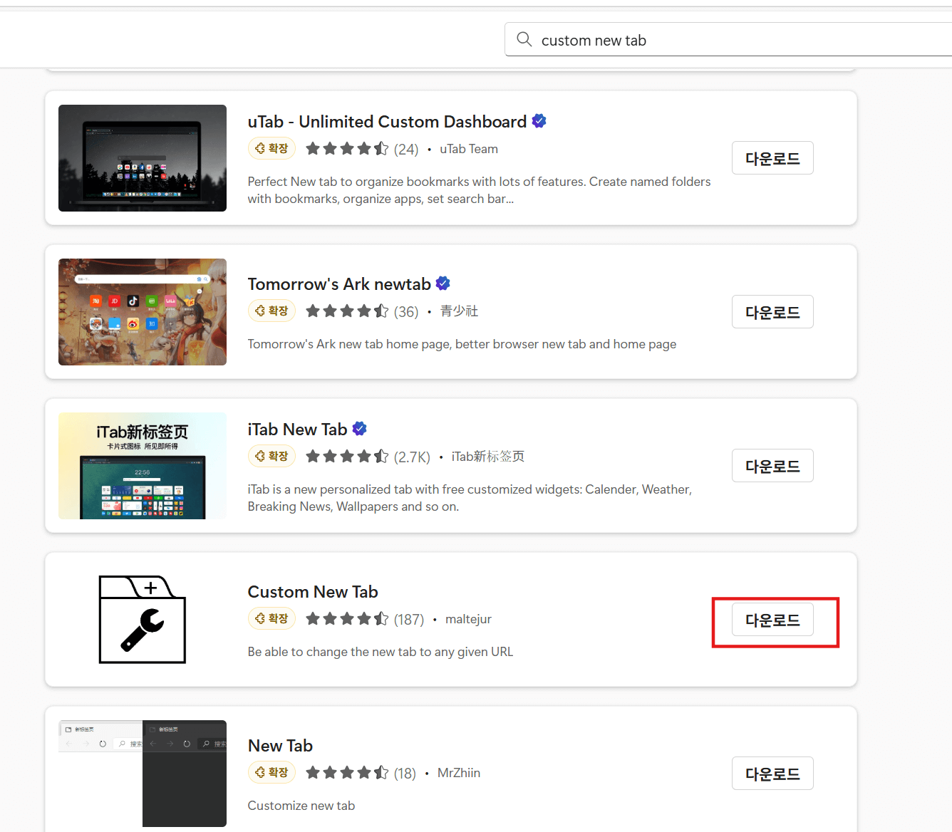 그런 다음 왼쪽 같은 다음 창 검색창에 [Custom] 입력 후 아래 나오는 리스트 중 [Custom new tap]을 선택합니다. 그럼 오른쪽 그림처럼 여러가지가 뜨는데요, 이 중 약간 아래쪽에 있는 프로그램을 [다운로드]를 눌러 설치합니다.
