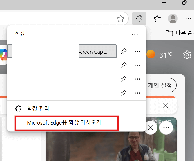 일단, 왼쪽 그림처럼 창의 우측 상단 [···] - [확장]을 차례대로 선택합니다. 그 후 오른쪽 그림처럼 [Microsoft Edge용 확장 가져오기]를 클릭합니다.