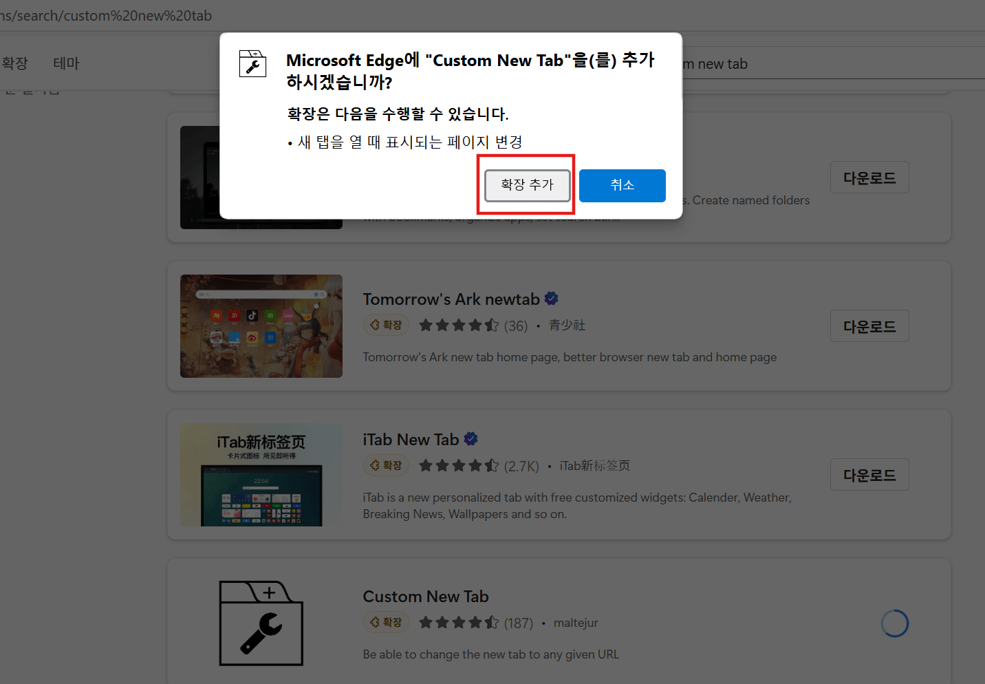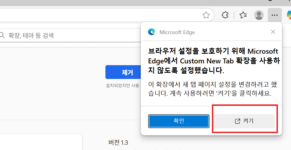 다운로드가 완료되면 왼쪽 그림처럼 'Microsoft Edge에 해당 프로그램을 추가하겠냐'는 질문에 [확장추가]를 누른 후, 오른쪽 팝업 창에서 [켜기]를 누릅니다.