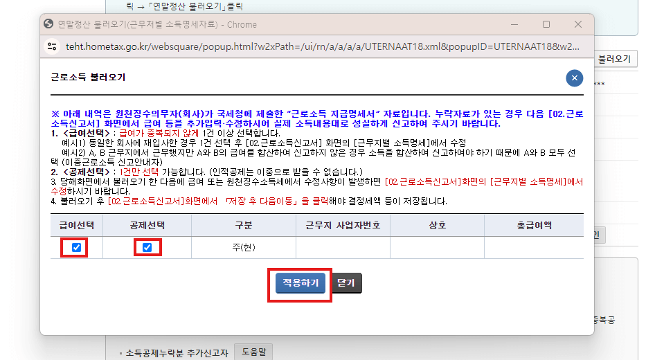 3번과 같은 다음 화면에서 [근무자별 소득명세]에서 오른쪽 [입력/수정하기]버튼을 누르면 4번과 같은 팝업창이 뜹니다. 사업장과 급여액 등을 확인 후, 맞다면 왼쪽 급여선택과 공제선택 체크박스에 체크 후 [적용하기]를 차례로 누릅니다.