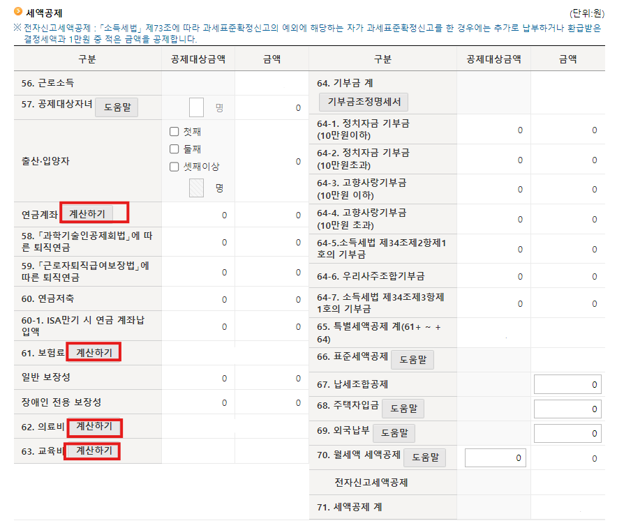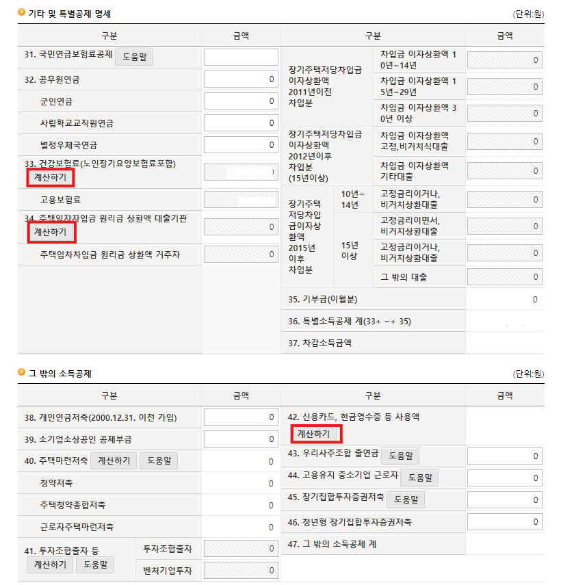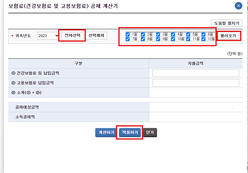 창을 아래로 더 내리면 6번 그림처럼 [기타 및 특별공제 명세]와 [그 밖의 소득공제]의 다양한 항목이 나오는데, 본인에게 해당하는 항목의 [계산하기]버튼을 누릅니다. 7번과 같은 팝업에서 [전체선택]을 누르면 모든 달이 선택되고 [불러오기] - [적용하기]를 차례로 누릅니다.