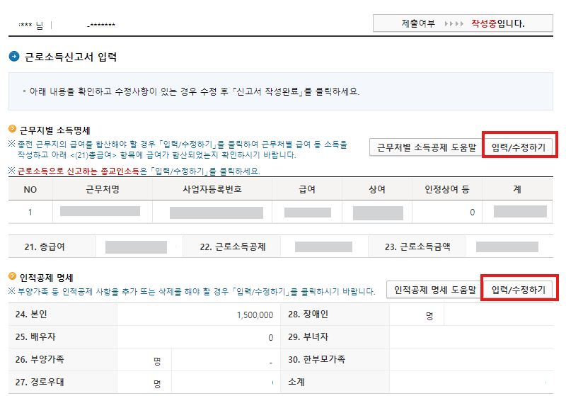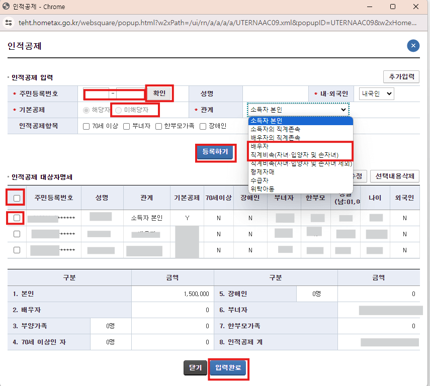 위의 3번 화면 아래 [인적공제 명세] 옆 [입력/수정하기] 버튼을 누르면 5번과 같은 팝업이 표시됩니다. 소득자 본인, 배우자, 직계 비속 등 관계 선택 후, [등록하기] 버튼을 누르면 아래에 차례로 목록이 표시됩니다. 주의할 점은 맞벌이의 경우 배우자 공제는 받을 수 없고, 자녀는 소득이 더 많은 쪽에서 공제를 받는 것이 유리합니다.