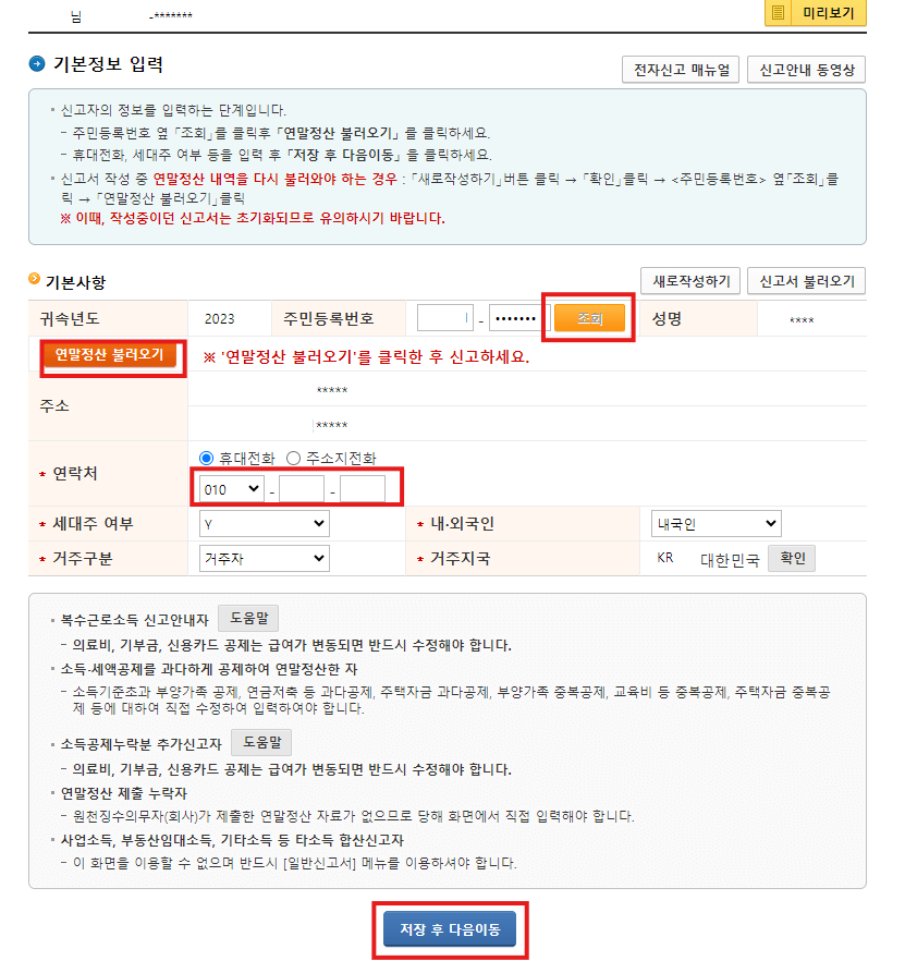 위의 링크를 통해 들어가서 로그인을 하면 1번과 같은 화면이 표시되는데, 근로소득과 다른 소득이 있는 경우에는 [모두 채움 신고] 탭을 이용해야 하지만 지금 이 글에서는 근로소득만 있는 근로자일 경우에 한해 말씀드리는 것이므로 [근로소득신고] - [정기신고] 탭을 차례로 선택합니다. 2번 화면이 표시되면 주민등록번호 옆 [조회] - [연말정산 불러오기] 버튼을 누르면 주소 등이 자동으로 표시되고 연락처 등을 입력한 후 아래 [저장 후 다음이동]을 누릅니다.