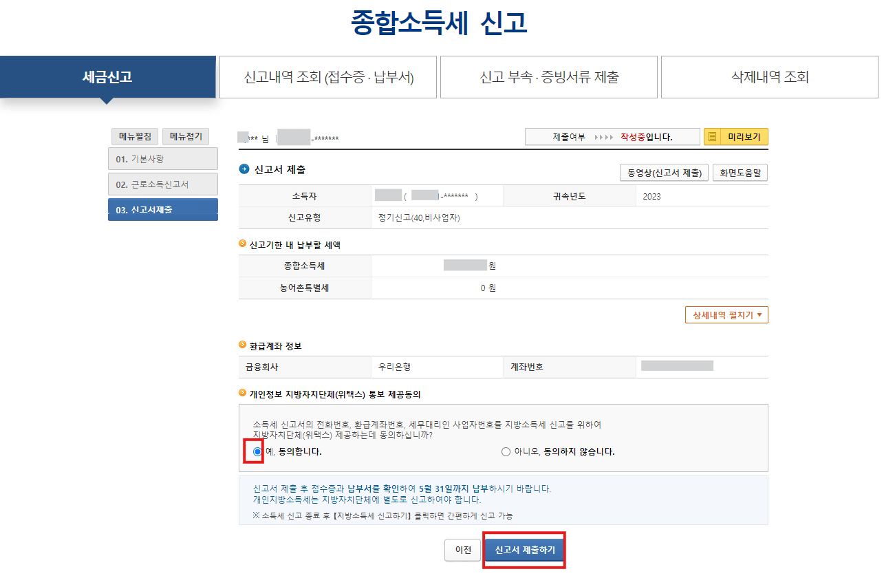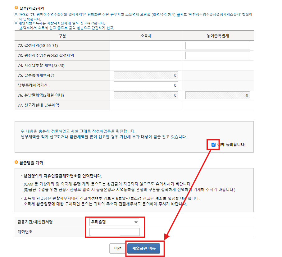 가장 아래 10번 그림에서 77번 항목에서 납부세액이 표시되는데 (-)이면 환급받게 되고 (+)이면 그 금액만큼 납부해야 합니다. 사실에 근거하여 작성했다는 동의 후 환급계좌 작성, [제출화면 이동]을 누릅니다. 10번의 납부세액 등이 다시 표시되고, 이를 바탕으로 위택스에 지방소득세 납부를 위한 자료제공 동의 [체크박스] 클릭 후 [신고서 제출하기]를 누르면 완료됩니다.