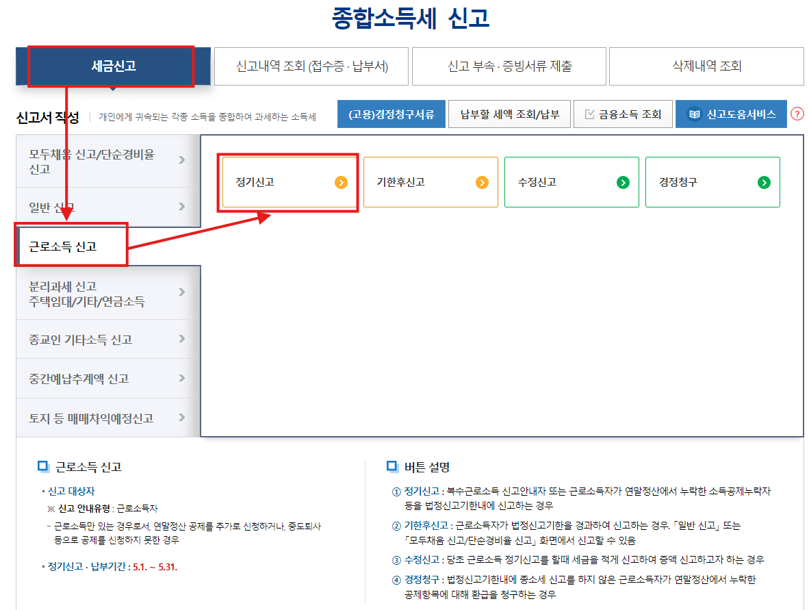2023년에 중도퇴사한 근로자들일 경우 2024.5.1 ~ 2024. 5. 31일에 직접 종합소득세 신고를 해야 하는데, 절차는 국세청홈택스 홈페이지에서 쉽게 신고 가능합니다.