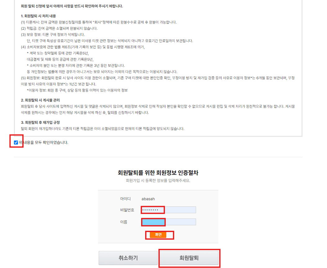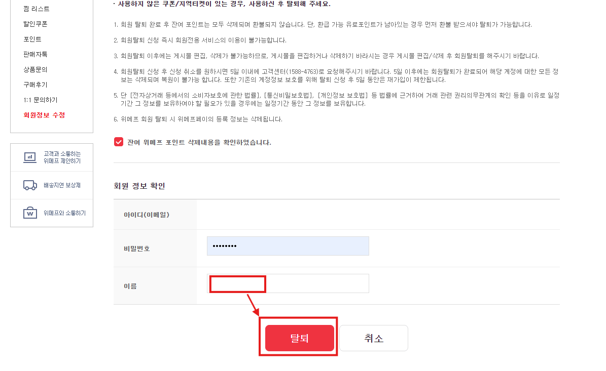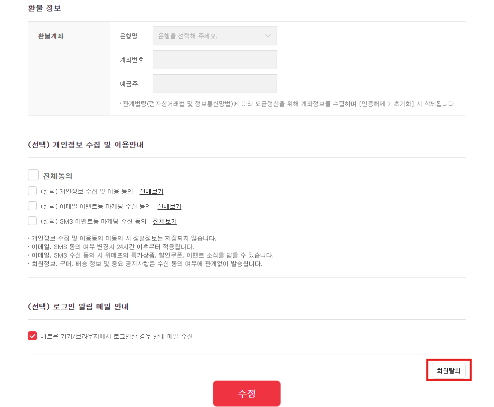 왼쪽과 그림과 같은 다음 화면에서 쭉 아래로 내리면 우측 하단에 작게 [회원탈퇴] 메뉴가 표시되는데, 이걸 누릅니다. 다음 화면에서 역시 회원탈퇴에 대한 내용이 나오는데요, 체크박스에 체크 후 비밀번호 및 이름을 한 번 더 입력하고 [탈퇴]를 누르면 완료됩니다.