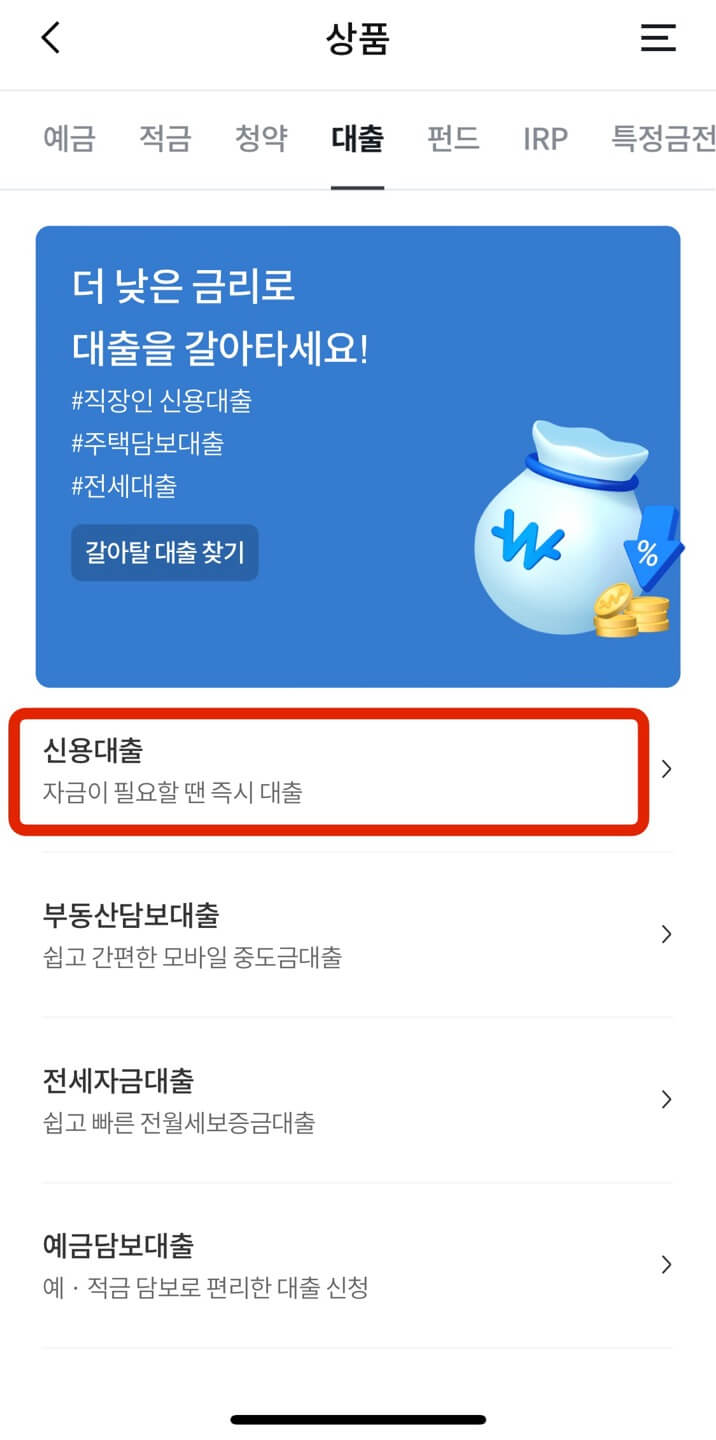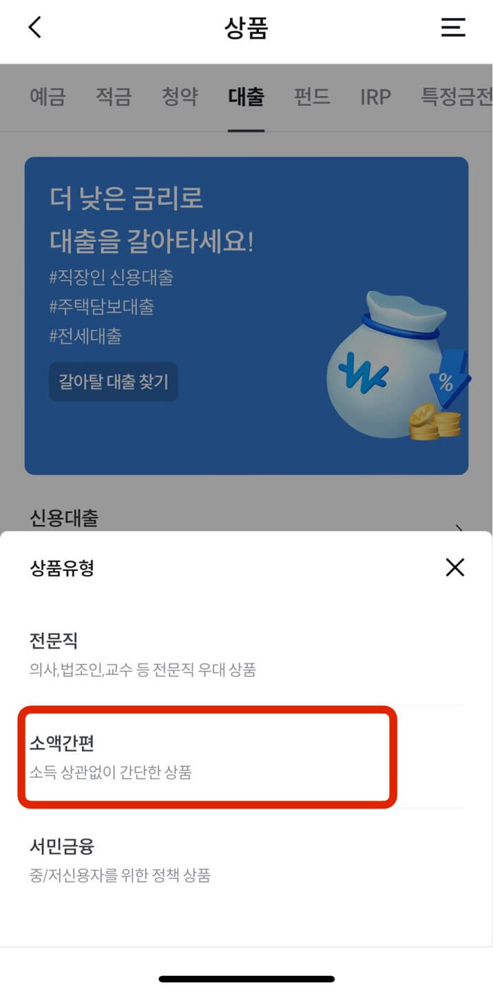 우리won뱅킹 어플을 설치 및 로그인 후, 1번과 같이 메인화면에서 하단 가운데 [상품] - [대출]을 선택합니다. 다음 2번 그림처럼 [신용대출] - [소액간편]을 차례로 선택합니다.
