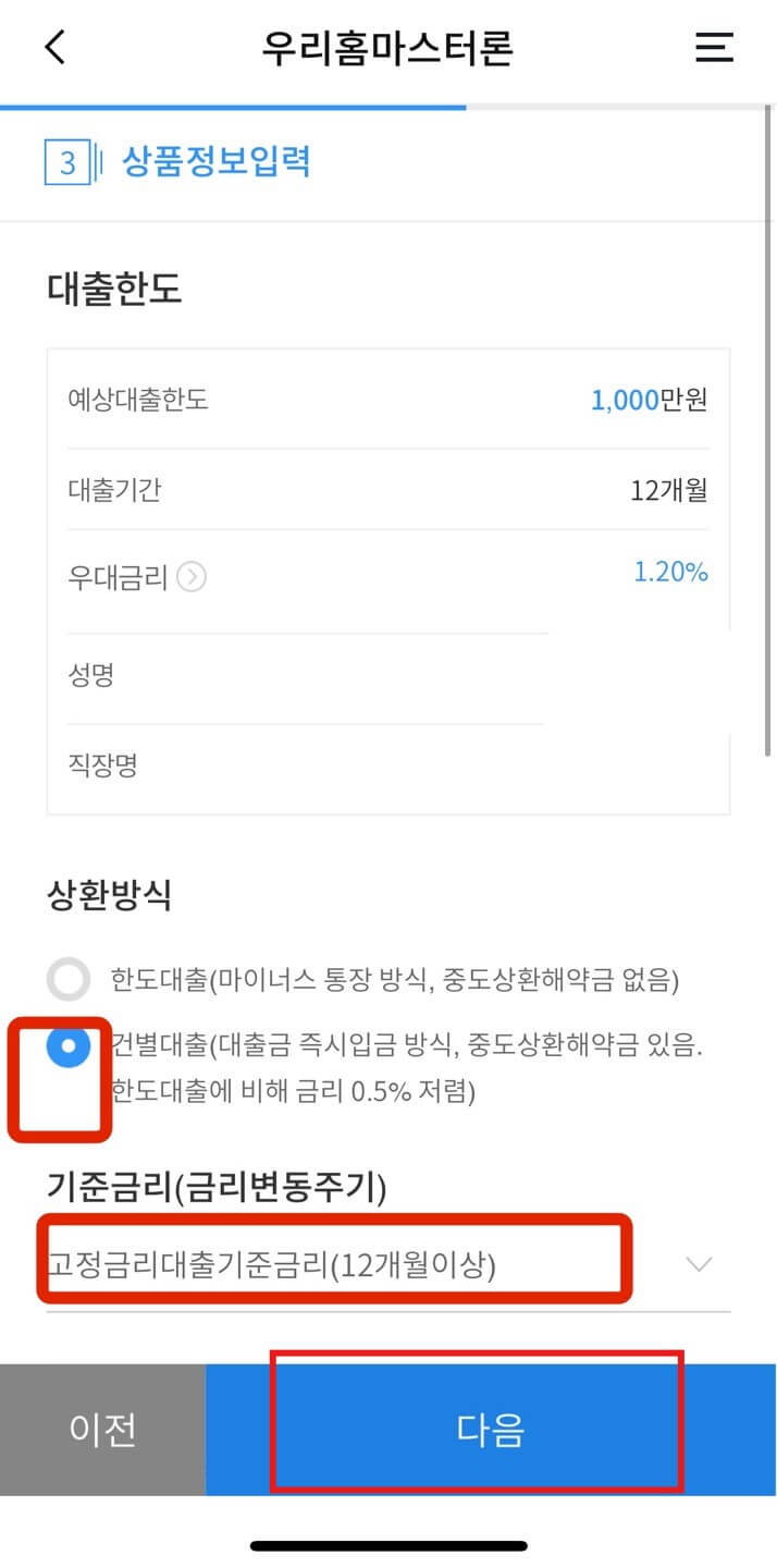 다음 13번과 같은 다음 화면에서 휴대폰 인증 후 [다음]을 누릅니다. 14번에서는 상환방식과 기준금리를 본인에게 필요한 방법으로 선택 후 [다음]을 누릅니다. 15번 화면에서 대출이자 자동출금계좌, 신청금액, 자금용도, 대출희망관리점 등을 선택 후 [다음]을 차례로 클릭합니다. 다음 화면에서 우리카드 이용실적에 따른 우대에 대한 선택 동의화면이 나오고 바로 승인여부가 표시되고, 바로 대출이 실행됩니다.