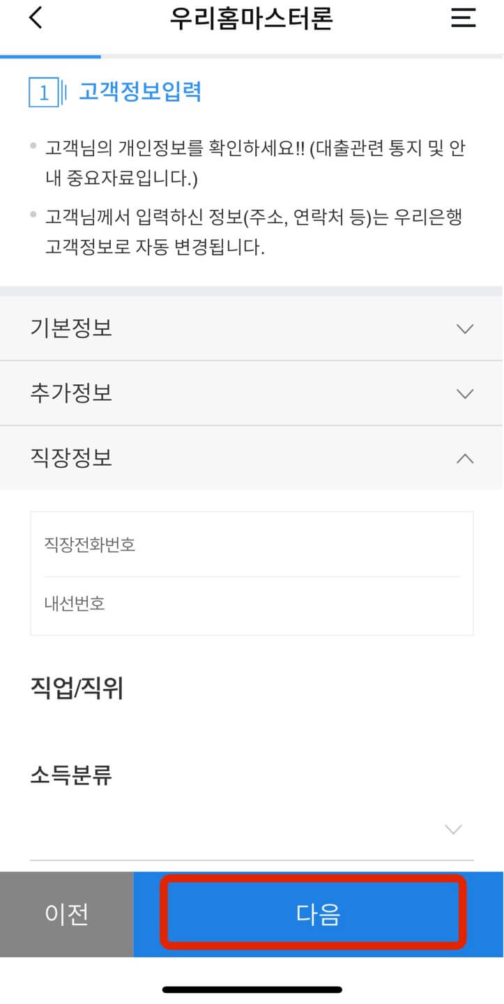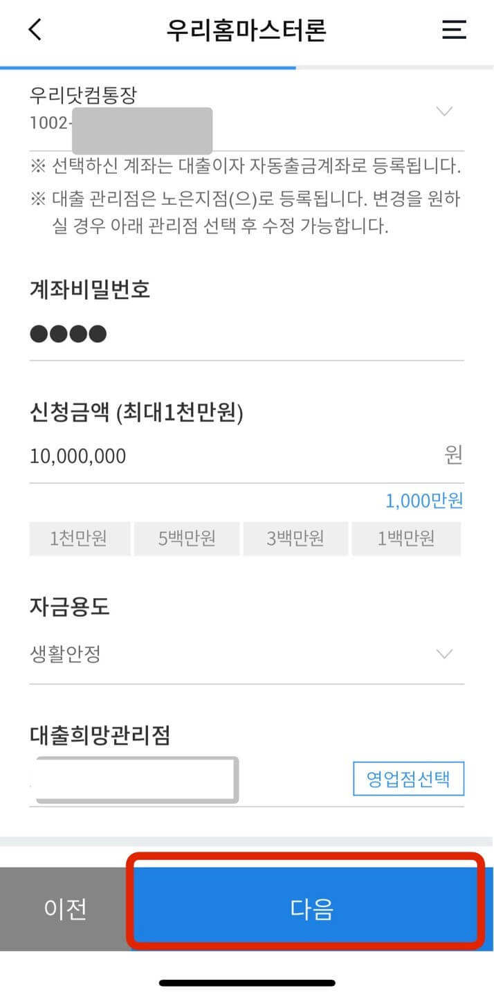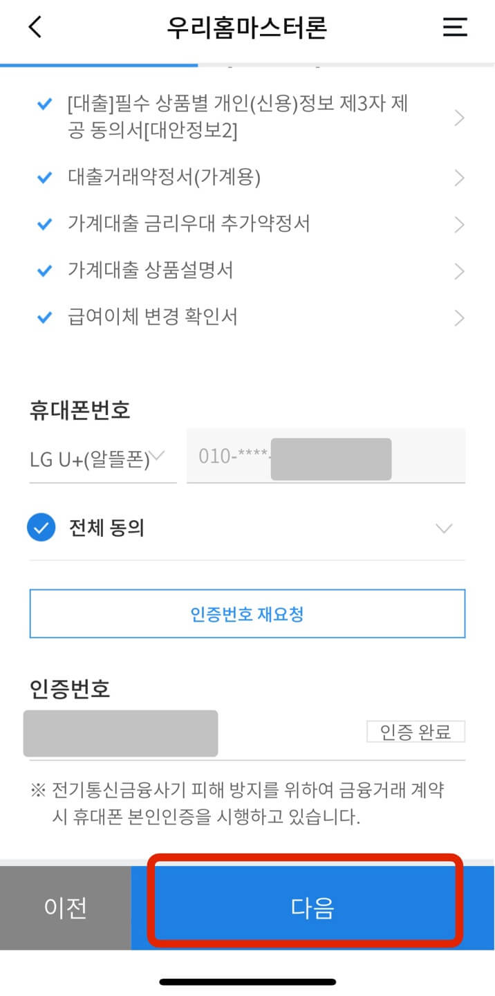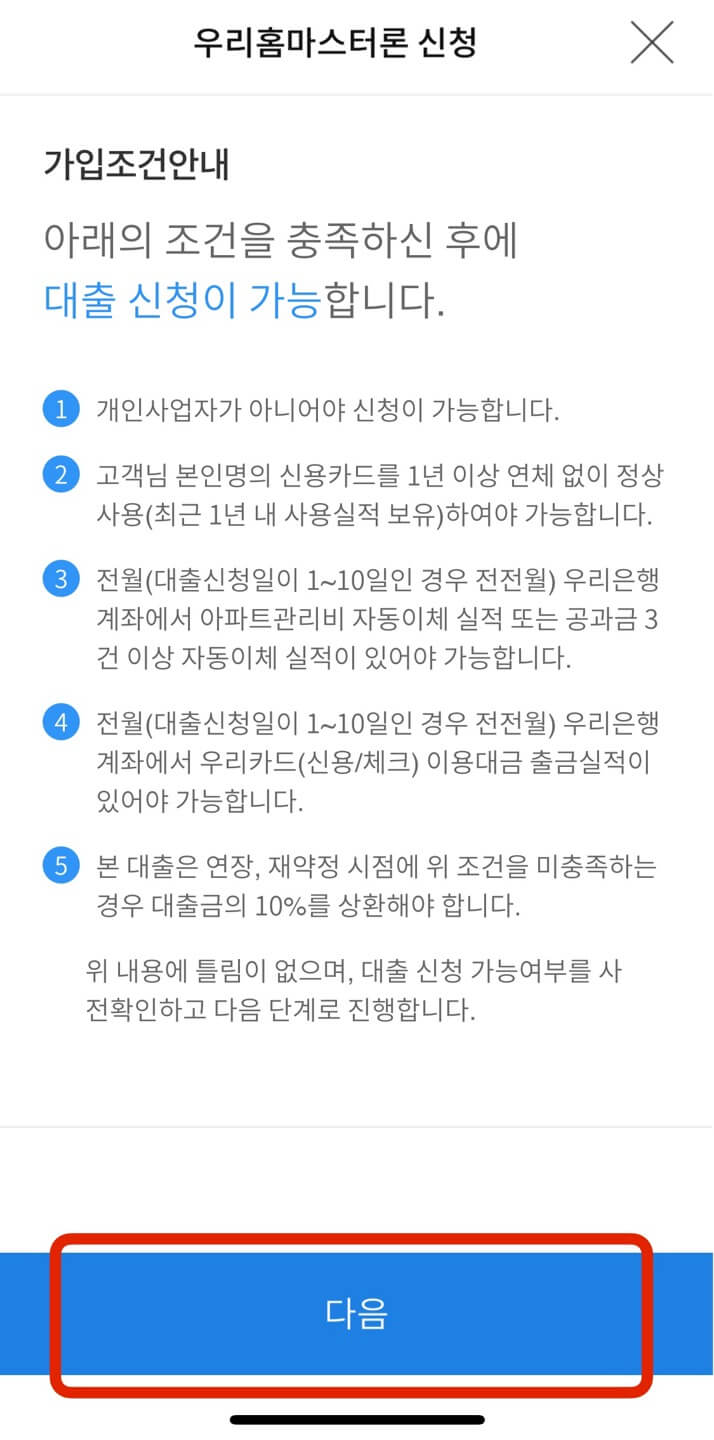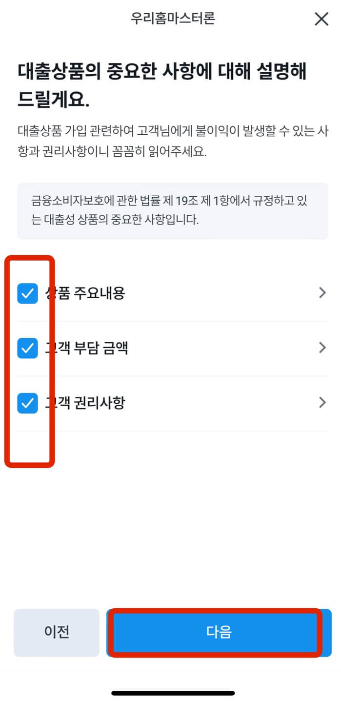 다음 화면에서 4번처럼 [우리홈마스터론]이 크게 표시되고, 그걸 클릭하면 5번 화면에서 [대출신청]이 본격적으로 시작됩니다. 6번 그림에서 상품주요내용, 고객 부담금액, 고객 권리사항 등을 꼼꼼하게 읽어보시고 각 내용 아래 체크박스를 모두 체크 후 [다음]을 누릅니다.
