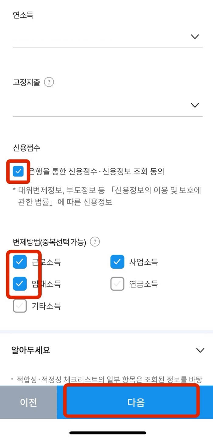 7번 그림처럼 우리홈마스터론의 대출조건에 대해서 한 번 더 명시하는 화면이 나오고 [다음]을 누릅니다. 8번 화면에서는 피성년·후피한정 후견인에 [아니오] 선택, 대출용도와 총자산 및 부채를 본인에 맞게 기입 후 [다음]을 선택합니다. 9번 화면에서 연소득 및 고정지출 등 선택, 신용점수 동의 체크박스에 체크 후, 변제방법을 본인에 맞게 선택 후 [다음]을 누릅니다.