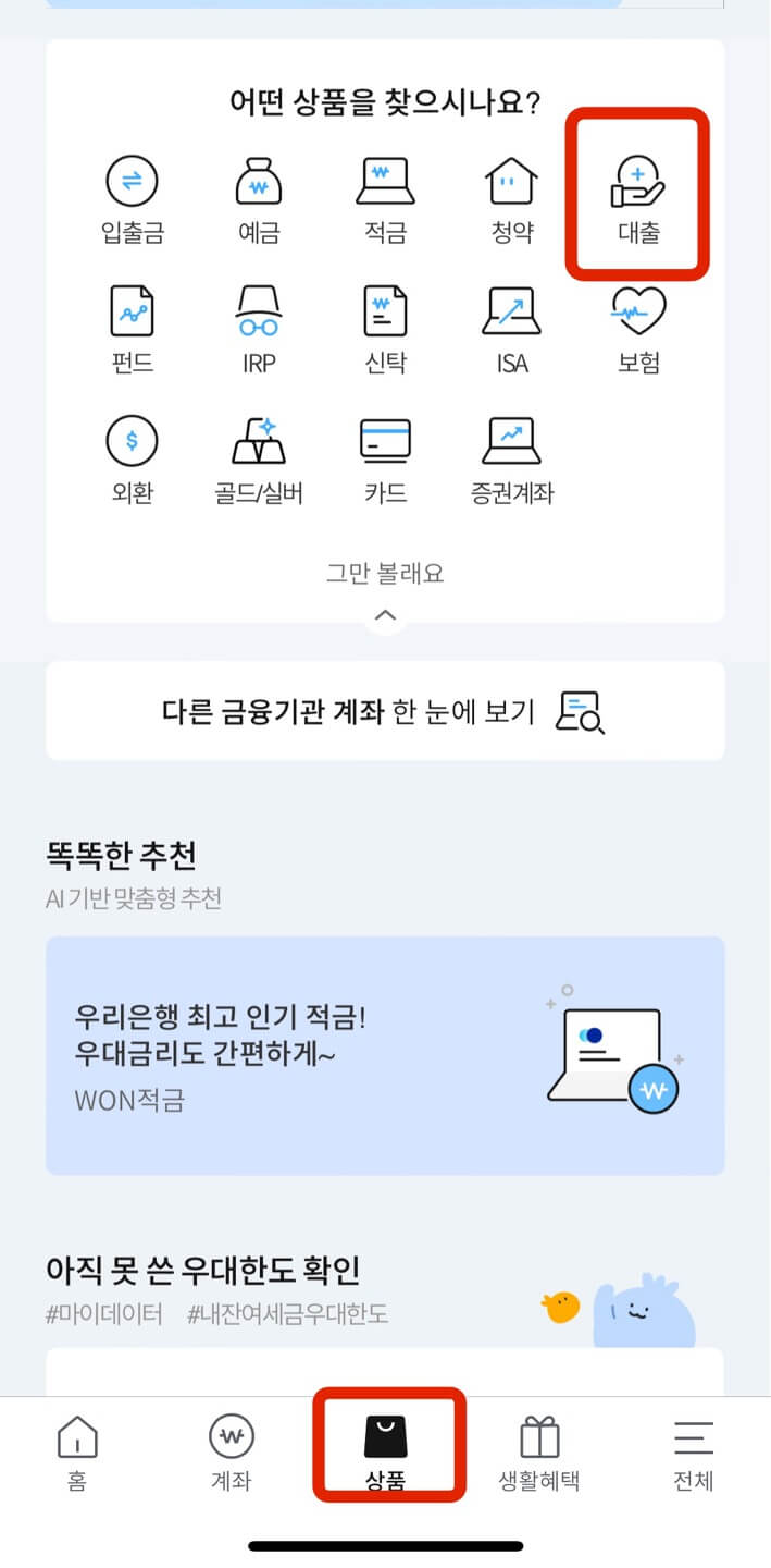 우리홈마스터론은 영업점, 인터넷, 스마트폰 어플로 신청이 가능합니다. 이번 글에서는 가장 간편하게 이용할 수 있는 우리은행어플(우리won뱅킹)을 통해 신청하는 방법에 대해 알려드리겠습니다.
