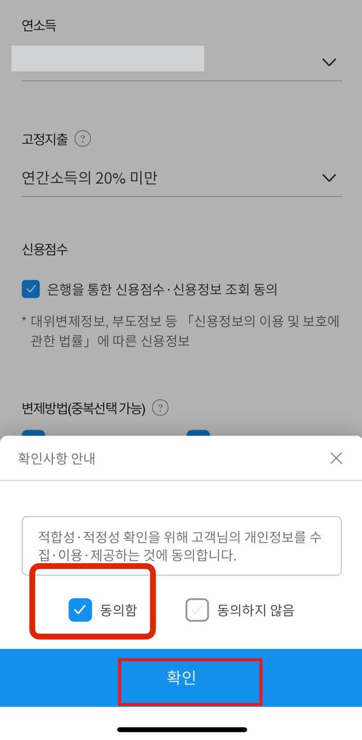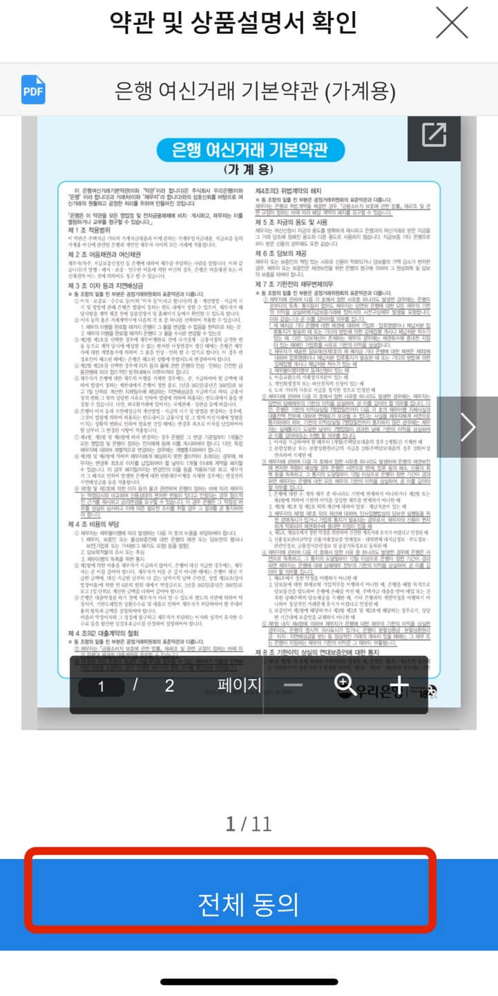 10번과 같은 팝업이 표시되는데, 적합성·적정성 확인에 개인정보 동의에 [동의함] 선택 후 [확인]을 누릅니다. 11번 화면에서는 주택 소유여부, 직장 정보 등에 대해 기입하는 란이므로 본인정보 입력 후 [다음]을 누릅니다. 다음 은행 약관에 관한 설명이므로 아래 [전체동의]를 선택합니다.