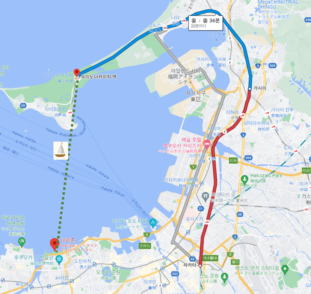 하카타역에서 마린월드가 위치해 있는 우미노나카미치( 海の中道) 역으로 지하철을 타고 이용하는 것은 1번 환승만 하면 됩니다. 하카타(博多) 역에서 JR가고시마본선을 타고 4 정거장, 가시이(香椎) 역에서 사이토자키( 西戸崎)행 열차를 타고 4 정거장을 타면 도착합니다. 전체 노선을 정리하자면 다음과 같습니다.