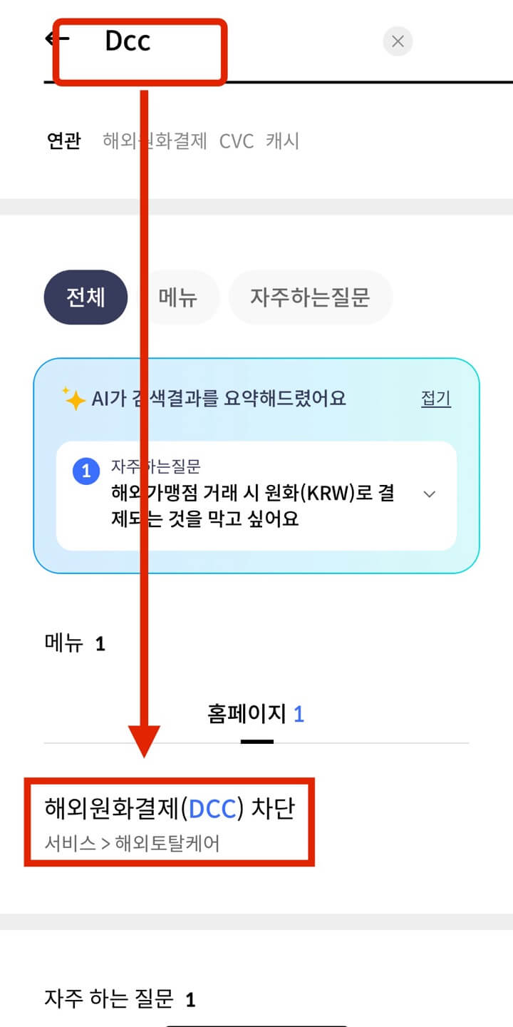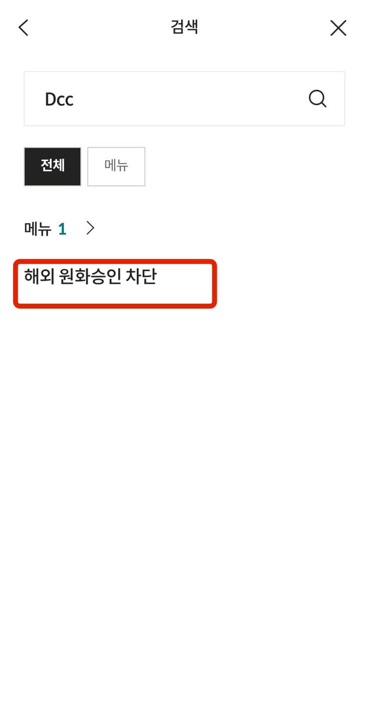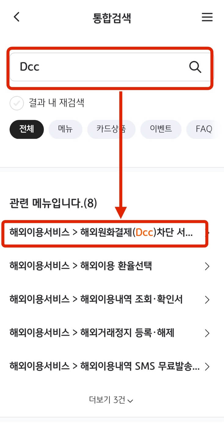 왼쪽 그림과 같은 신한카드 어플 메인화면에서 우측 상단 [돋보기]를 누릅니다. 다음 화면 검색창에 [DCC] 입력 후 하단의 [해외원화결제(DCC) 차단]을 선택합니다.