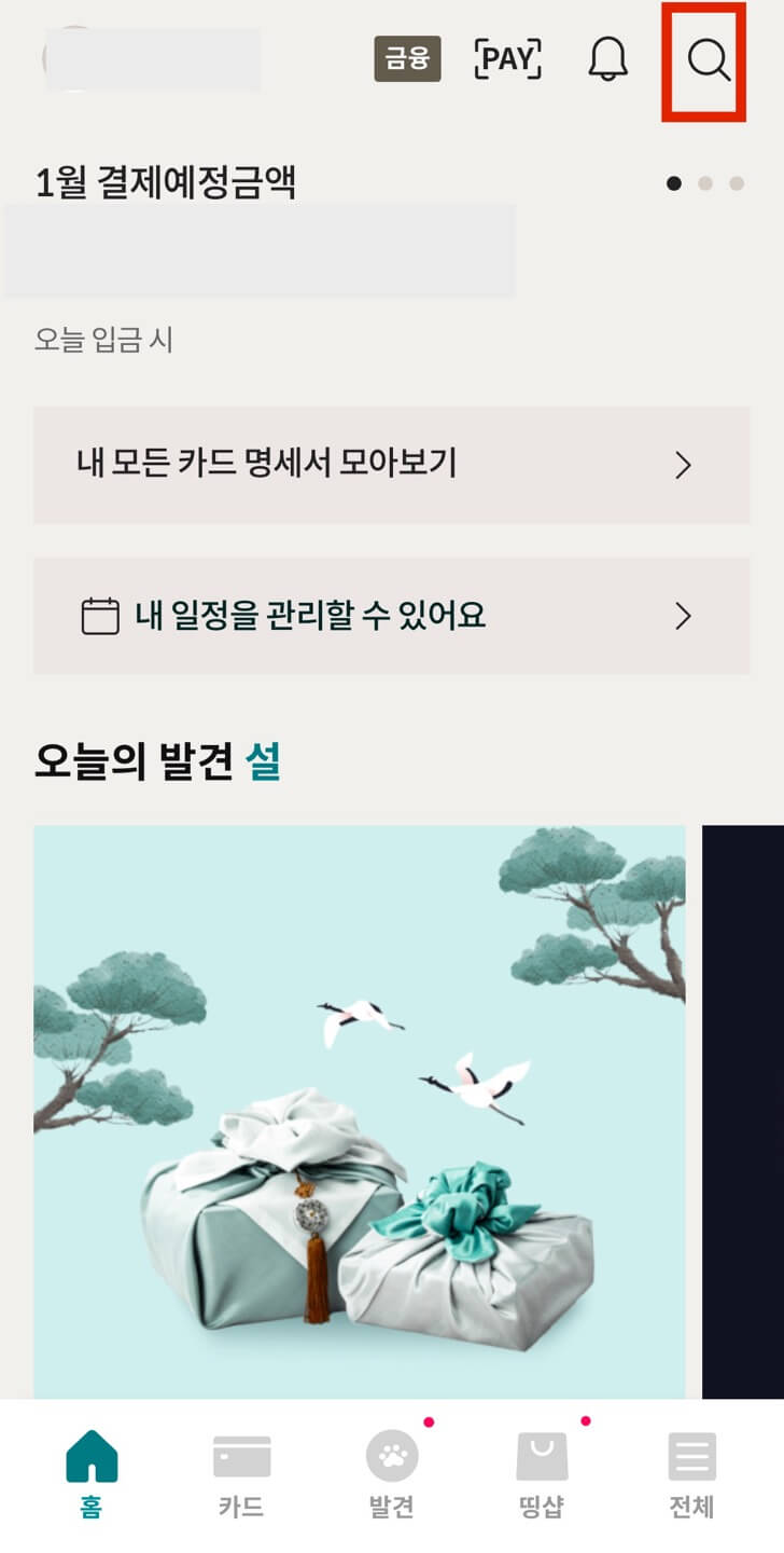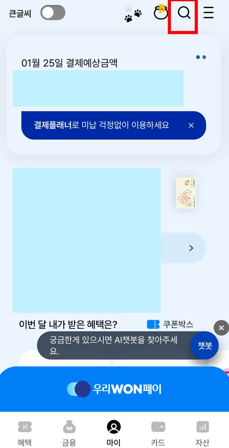 역시 왼쪽 그림과 같은 우리카드 어플 메인화면에서 우측 상단 [돋보기]를 누릅니다. 우리카드 어플이 다른 카드와 다른 점은 여기에서 'DCC'를 입력하면 원하는 메뉴값이 나오지 않습니다. 한글로 '원화결제' 등을 입력 후 나열되는 [해외원화결제]등의 메뉴를 선택합니다.