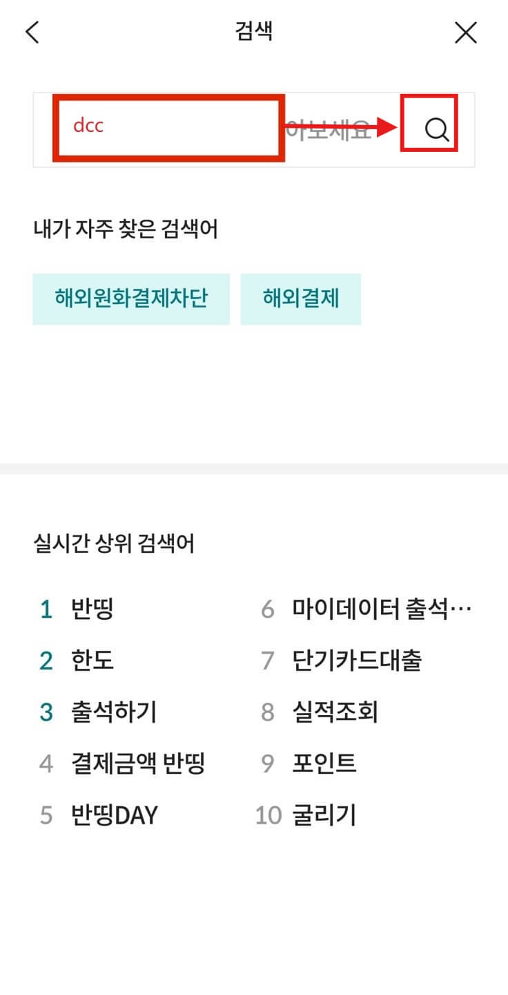맨 왼쪽과 같은 롯데카드 어플 메인화면에서 우측 상단 [돋보기]를 누른 후, 오른쪽 화면에서 검색 창에 [DCC]를 입력 후, 오른쪽 돋보기를 누릅니다.