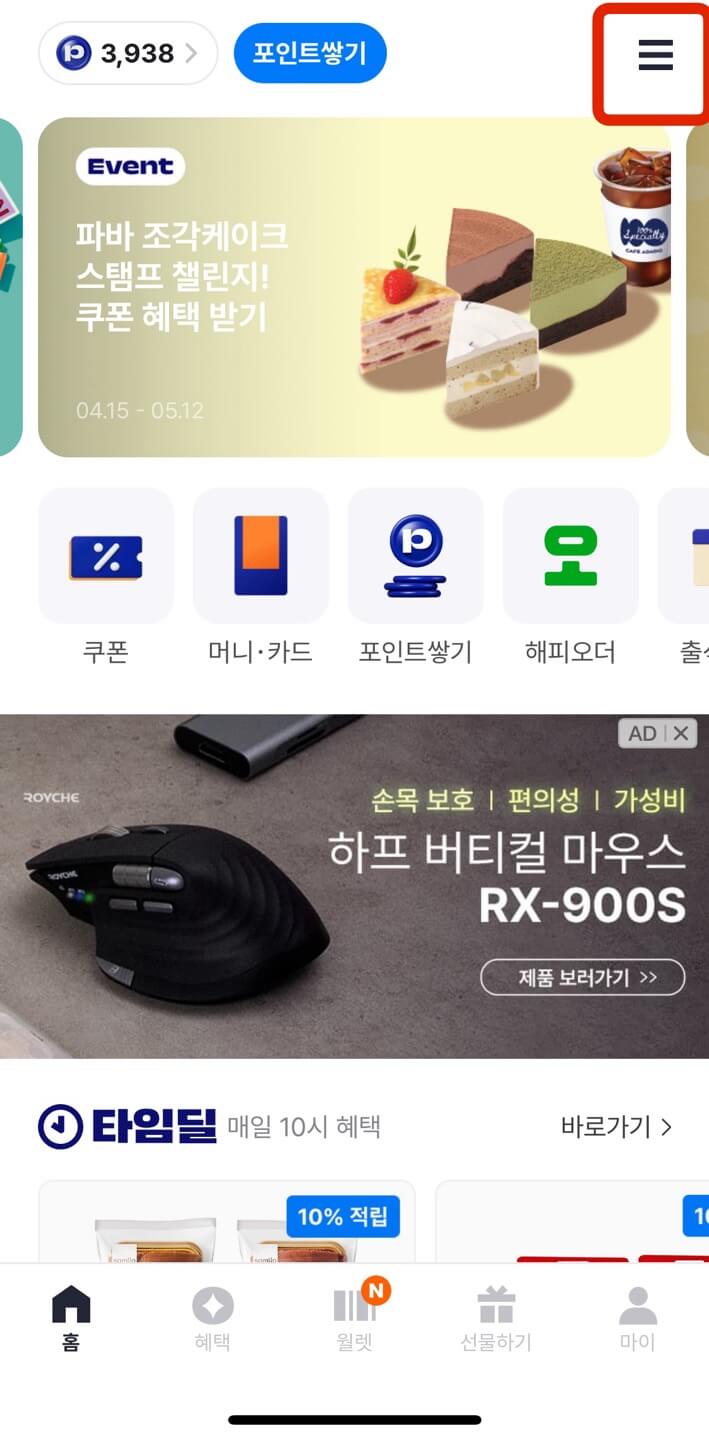 먼저, 해피포인트 어플 메인화면에서 우측상단 [줄 세개] - [선물함] - 우측하단 [ + ] 탭을 클릭합니다.