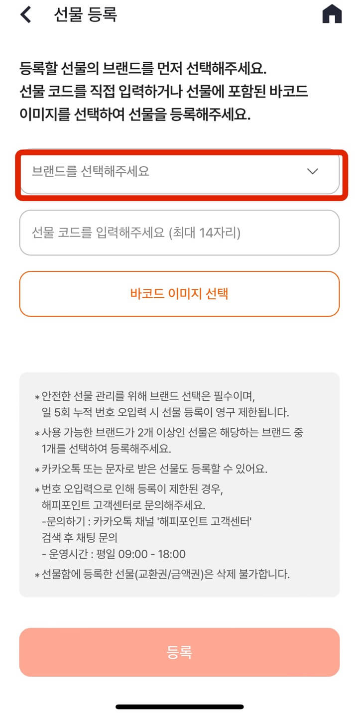 그 다음, [받은 선물 등록] - [브랜드 선택] - 두번째 줄 맨 우측 [해피콘 통합권]을 차례로 선택합니다.
