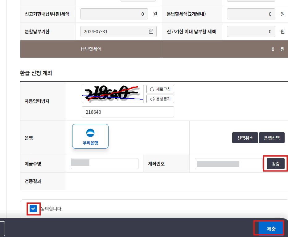 5번 그림에서는 환급 계좌만 제대로 적어 주고 [검증] - 좌측 하단 [체크박스] - [다음]을 차례로 누릅니다. 6번과 같이 지방소득세 신고서 제출이 완료되었다는 화면에서 좌측 하단 [신고서 제출] 버튼을 누르면 완료됩니다. 이 때도 연말정산과 마찬가지로 금액이 (-)이면 5번에 적어둔 계좌로 환급이 되고, (+) 일 경우엔 6번에 적힌 가상계좌로 납부해 주시면 됩니다.